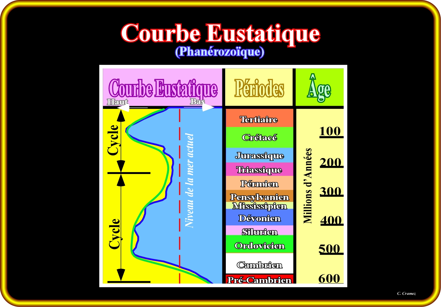 En supposant que le volume d'eau (sous toutes ses formes) est constant depuis la formation de la Terre, les changements du niveau des mers, par rapport au niveau actuel, résultent des facteurs suivants : (i) Forme et volume des bassins océaniques ; (ii) Redistribution de l'eau dans les bassins océaniques et (iii) Mouvement vertical des zones côtières. Les variations du niveau de la mer, contrôlées par des mécanismes géologiques internes de la Terre et la croissance ou la fonte des calottes glaciaires, ont des amplitudes et durées caractéristiques. Les mécanismes dynamiques du manteau modifient les formes des bassins océaniques, plus ou moins, tous les 100 My. Les mécanismes tectoniques qui se produisent dans la croûte, produisent des mouvements différentiels entre terre et mer, à échelles temps très variées. Cependant, l'influence de ces processus est limité (centaines de kilomètres). Les variations du niveau de la mer provoquées par les glaciations ont un caractère global et local, avec une échelle temps entre 1 et 100 ky. Les cycles eustatiques, autrement dit, les cycles des variations du niveau de la mer, ont une hiérarchie temporelle (durée). Dans cette figure, sont représentées deux courbes eustatiques. La première, plus émoussée, représente, pour le Phanérozoïque, la courbe eustatique de hiérarchie 1 (courbe long terme émoussée). Elle est composée de deux cycles eustatiques de 1ère ordre, c'est-à-dire, deux cycles avec une longueur d'onde (durée) supérieure à 50 My. Pendant le cycle le plus ancien, se sont déposés les sédiments paléozoïques, alors que pendant le plus récent se sont déposé les sédiments du Méso-Cénozoïque. La deuxième courbe (hiérarchie 2, courbe long terme) est beaucoup moins émoussée. Elle est composée de cycles eustatiques de 2ème ordre, qui ont une durée comprise entre 3.5 et 50 My.