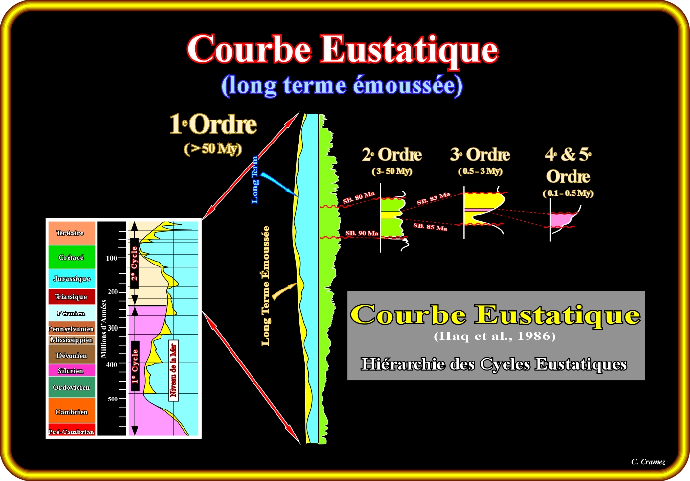 Le niveau de la mer sert de référence pour mesurer les hauteurs du continent et les profondeurs des fosses océaniques. Toutefois, il n'est pas fixe, et il n'est pas, non plus, une surface horizontale. En fait, un certain nombre de facteurs entraînent des variations dans le niveau de la mer, entre les différents points de plusieurs mètres et les variations globales entre différents moments de l'histoire géologique. Ainsi, par exemple, actuellement, il y a une différence du niveau de la mer d'environ 40 cm entre la Nouvelle-Écosse et la Floride Également, entre les Maldives et la Papouasie, la différence du niveau de la mer est supérieure à 200 mètres. La courbe eustatique illustrée dans cette figure est la courbe que Haq a proposé, en 1986, pour le Phanérozoïque. Cette courbe est composée de cycles eustatiques de divers ordres, qui ont été définies sur la base de la durée de chaque cycle. Un cycle de 4e ordre ou d'ordre supérieur (5e ordre) a une durée de moins de 0.5 My. Un ensemble de cycles de 4e ordre forme un cycle eustatique de 3e ordre, dont la durée comprise entre 0.5 et 3 - 5 My (dans cet exemple, le cycle eustatique de 3e ordre est limité entre les discordances SB. 83 Ma et SB. 85 Ma ou les chutes relatives du niveau de la mer associées. Un ensemble de cycles eustatiques de 3ème ordre forme un cycle eustatique de 2ème ordre, dont la durée varie entre 3 - 5 et 50 My (SB. 80 Ma et SB SB. 90 Ma, dans cet exemple). Un ensemble de cycles eustatiques de 2ème ordre forme un cycle eustatique 1e ordre, dont la durée varie entre 50 et 400 Ma (SB. 0 et SB. ± 230 Ma, dans cet exemple). En d'autres termes, un cycle eustatique de 3e ordre correspond à l'émoussement de plusieurs cycles eustatique de 4ème ordre ou supérieur et un cycle eustatique de 2e ordre correspond à émoussement de plusieurs cycles de 3e ordre, ainsi qu'un cycle de 1ème ordre correspond à l'aplatissement de plusieurs cycles de 2e ordre. La courbe de longue durée, illustré ci-dessus, correspond à l'émoussement des cycles de 3e ordre, ce qui signifie qu'elle souligne, les cycles de 2e ordre. De même, la courbe long terme émoussée correspond à l'enveloppe courbe de longue durée, à savoir, l'émoussement des cycles de 2e ordre, et souligne donc parfaitement les cycles de 1e ordre, c'est à dire, le Paléozoïque et le Méso-Cénozoïque.