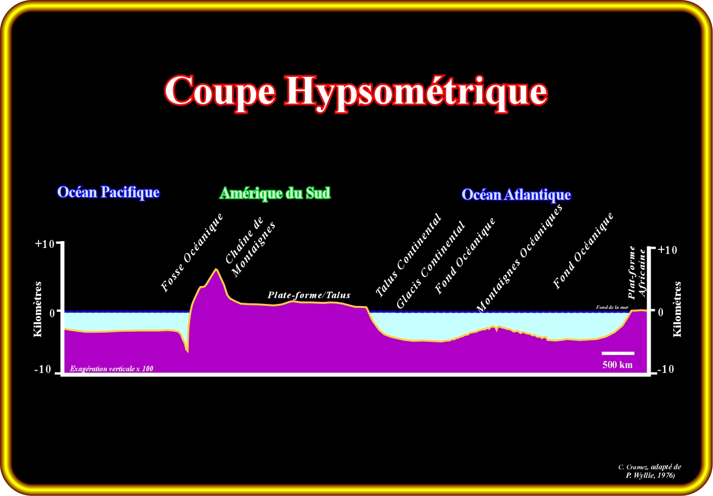 Dans cette coupe hypsométrique, les trois éléments les plus importants sont : (i) Plate-formes continentales (Amérique du Sud et Afrique de l'Ouest) ; (ii) Fond des bassins océaniques (Atlantique Sud et Pacifique) et (iii) Montagnes sous-marines. La limite entre les plate-formes et les fonds océaniques est le talus continental, qui descend de manière abrupte dès le rebord continental jusqu'au plancher océanique (inclinaison entre 3 et à 6°). La différence du relief terrestre est d'environ 20 km et correspond à la différence entre le pic de l'Everest (± 8850 m) et la plus profonde fosse océanique (± 11 000 m). La plus importante chaîne de montagnes est située sur le plancher océanique et s'étend sur plus de 65 000 km, avec une largeur variable, dont la moyenne est environ 1000 km. Cette coupe permet de comprendre la structure des marges continentales divergentes et convergents. Dans les premières, il y a expansion océanique et formation de montagnes volcaniques sous-marines, ce que crée un fond océanique de chaque côté, entre ces montagnes et les glacis continentaux (zone limite de la marge continentale, entre la plaine abyssale et le talus continentale), avec socle crustal océanique sur lequel prédominent des dépôts turbiditiques). Les marges continentales divergentes se sont développées pendant l'expansion océanique qui a suivi la rupture de la lithosphère d'un supercontinent, dans ce cas, le Gondwana. Dans une première phase, les sédiments du Gondwana ont été allongés par un régime tectonique extensif (σ_1 vertical) avec la formation hémi-grabens (failles normales) qui ont été remplis par des sédiments non-marins (bassins de type-rift). Après la rupture de la lithosphère, les prismes sédimentaires qui forment les marges divergentes, se sont déposés, peu à peu, au fur et à mesure que l'océan entre les deux marges s’élargit. Dans les marges convergentes, il y a une réduction du plancher océanique. La croûte océanique plus âgée et plus dense plonge sous la croûte continentale et entre dans l'asthénosphère le long des zones de subduction, où elle est partiellement digérée. Les zones de subduction sont soulignées par les fosses océaniques profondes, comme la fosse océanique qui borde, à l'Ouest, le continente Amérique du Sud.
