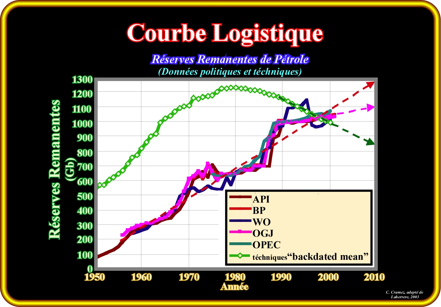 La courbe du taux de production de pétrole qui dépend linéairement de la quantité de pétrole (encore à produire) qui existe encore dans le ou les réservoirs, autrement dit, le pétrole qui reste dans le sous-sol, est fonction du temps, ce qui veut dire, qu'elle peut être représentée par une courbe logistique ou par sa dérivée. Les échelles de la courbe dérivée sont : (i) Temps, en général, années en abscisse et (ii) Réserves restantes, en ordonnées. Dans cet exemple, on peut dire que les données techniques (valeur espérée au moment de la découverte) suggèrent fortement qu'à partir de l'année 1980, ont été produites plus de réserves que celles découvertes. Toutefois, les compagnies pétrolières et organisations internationales, ont continué à dire que se découvrait plus de réserves que celles produites. Bien sûr, que la majorité des géoscientistes savaient, que cela n'était pas vrai. En fait, la grande majorité des compagnies pétrolières, pour passer un tel message, incluaient dans les réserves restantes, non seulement les réserves non conventionnelles (comme, les réserves des schistes bitumineux), mais aussi ce qu'on peut appeler les réserve politiques (réserves pure et simplement spéculatives) pour justifier les quotas de production. De toute façon, dans l'industrie du pétrole, quelle que soit la courbe présentée, il y a toujours un point de taux de production maximale, basée sur le taux des découvertes, taux de production ou production cumulative. Au début de la courbe (avant le pic), le taux de production augmente, dû aux taux des découvertes et au développement des infrastructures. Dans la partie finale de la courbe (après le pic), la production diminue en raison de l'épuisement des ressources.