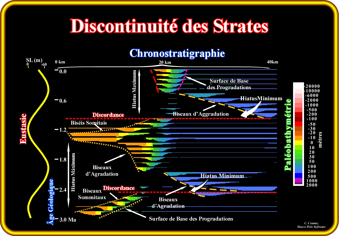 Les discontinuités dans les strates peuvent être : (i) Discordances ; (ii) Disconformités ou (iii) Hiatus de non-dépôt. Ces surfaces, quand représentées sur une coup géologique sont composées de deux segments sub-horizontaux séparés par un talus. L'âge des discordances est donné par l'âge de l'hiatus minimum, qui, dans la plupart des cas, est situé à la base du talus continental ou dans la plaine abyssale, où, pratiquement, il y a continuité de la sédimentation. La limite d'un cycle stratigraphique, comme, par exemple, la limite inférieure d'un cycle-séquence correspond à une surface d'érosion (discordance), laquelle représente un hiatus ancien créé par l'érosion (au moins en amont du rebord du bassin). D'autre part, à l'intérieur d'un cycle-séquence, un hiatus plus récent que celui associé avec la discordance inférieure, est généralement, un hiatus de non-dépôt. Dans ce diagramme chronostratigraphique sont représentés : (i) Eustasie ; (ii) Terminaisons des Réflexions ; (iii) Discontinuités de strates, à savoir, biseaux d'aggradation, biseaux de progradation et biseaux sommitaux ; (iv) Hiatus ; (v) Discordances et (vi) Paléobathymétrie. Les principales surfaces de base des progradations et les surfaces des biseaux d'aggradation sont facilement identifiables, une fois que les premières inclinent vers la terre, dans ce cas vers la gauche, mais progradent vers la droite, c'est-à-dire, vers la mer. Les surfaces d'aggradation, qui fossilisent les discordances, inclinent vers la droite (vers la mer), mais empiètent le continent ( gauche). Les biseaux sommitaux ou biseaux supérieurs sont reconnaissables sous les discordances, mais ils se déplacent vers la droite (vers la mer), contrairement aux biseaux d'aggradation. Les hiatus maximum et minimum sont reconnues facilement, ce qui permet une datation correcte des discordances (hiatus minimum). La paléobahymétrie augmente en l'aval (droite). Les surfaces des biseaux d'aggradation, en eau profonde, suggèrent des cônes sous-marins de bassin et talus. Notons que la seule façon de dater correctement une discordance est de dater les cônes sous-marins de bassin associés avec la chute relative du niveau de la mer qui a induit la surface d'érosion (discordance), ce qui signifie que en tous les autres cas cas, l'erreur de datation est beaucoup plus grande.