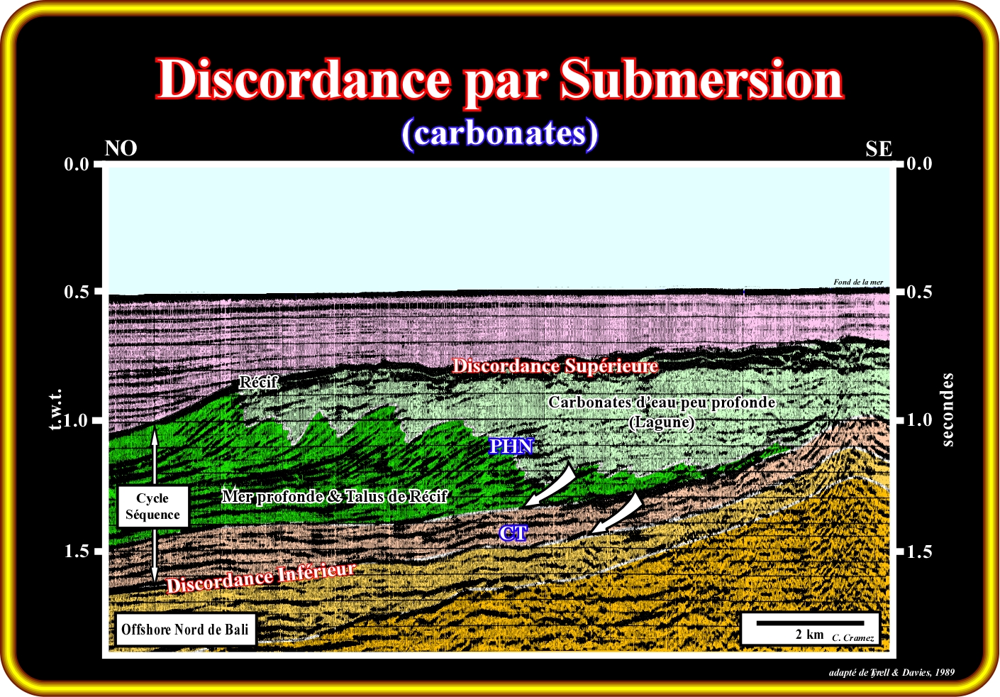 Dans cette ligne sismique, il est probable que la limite supérieure du cycle-séquence, formé de carbonates, correspond à une discordance par noyade, cela signifie qu'une chute significative relative du niveau de la mer a placé le fond de mer au-delà de la zone photique, ce qui, évidemment, a causé la fin de la formation de carbonate et la mort de la plate-forme carbonatée. Les discordances par noyade sont, la plupart du temps, associées à une interface entre les carbonates (en-dessous) et siliciclastiques, ce qui est typique des plates-formes carbonatées reliées au continent, autrement dit, des plate-formes qui ont un apport terrigène importants après la noyade. Cependant, dans les plates-formes isolées, comme cela semble être le cas dans l'exemple illustré sur cette ligne sismique qui sont déconnectés du continentale, après la noyade l'apport terrigène est faible, ce qui permet que la sédimentation carbonatée puisse revenir après la noyade, si le fond de la mer est, à nouveau, dans la zone photique. Cela signifie que dans de telles conditions, des discordances par noyade peuvent apparaître, également, entre interfaces carbonatées. Dans ces cas, elles sont caractérisées par des surfaces durcies, déposées pendant les périodes où le taux de sédimentation est très faible. En fait, on peut dire que toutes les surfaces d'inondation d'une plate-forme carbonatée sont discordances par noyade et non, uniquement, associés avec transgressions rapides et majeures. Dans la stratigraphie séquentielle, une discordance par noyade est considérée comme toute autre discordance, une limite de cycle stratigraphique, c'est-à-dire une surface d'érosion. Cependant, pour certains géoscientistes, l'utilisation des discordances par noyade, qu'ils considèrent comme des surfaces d'inondation, comme les limites des cycles stratigraphiques correspond à la méthode utilisée dans la stratigraphie génétique et non en stratigraphie séquentielle, sauf que ni toutes les surfaces d'inondation maximale sont des discordances par noyade, mais, uniquement, celles induites par des transgressions rapides.