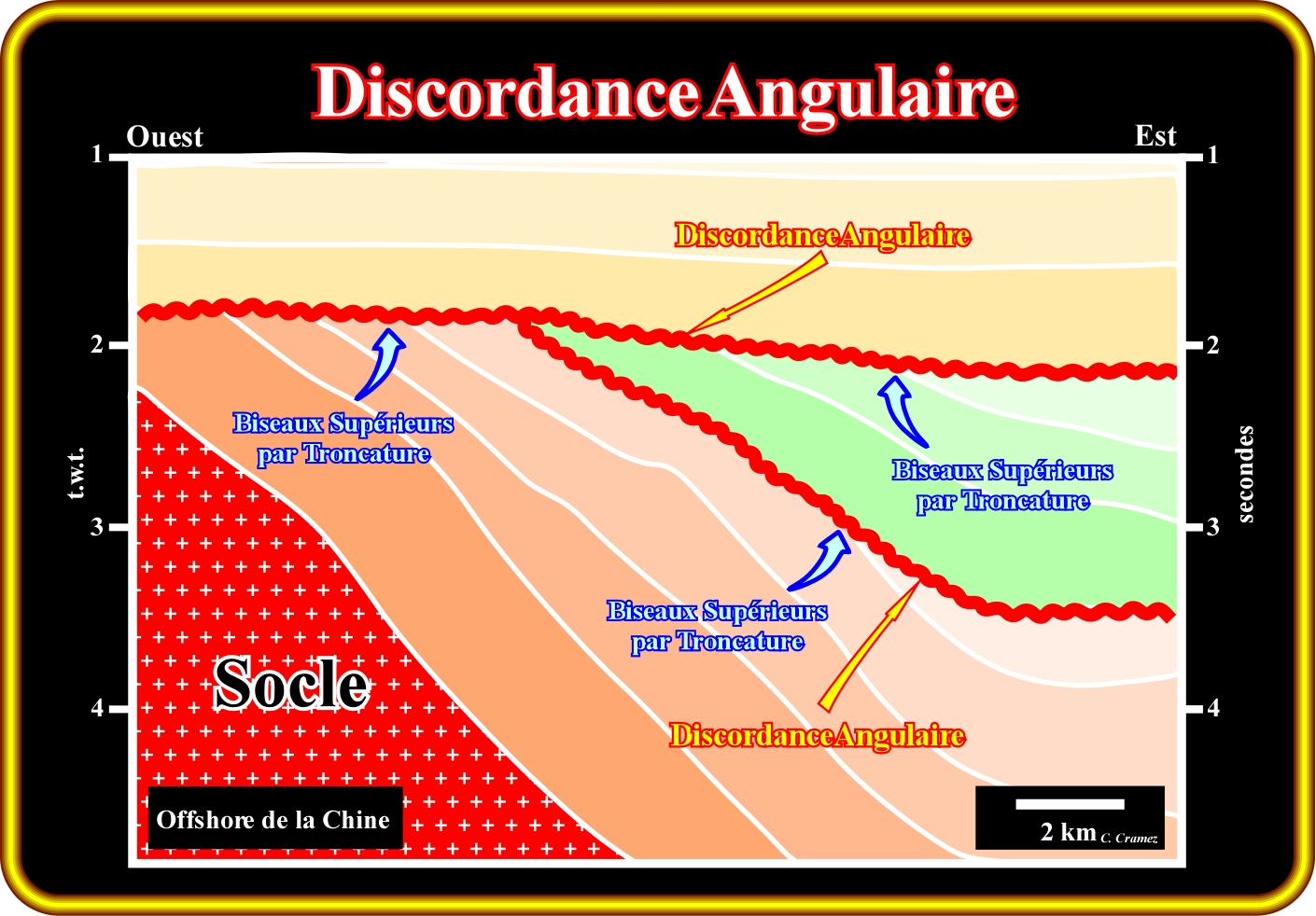 Deux discordance angulaires sont reconnues dans cette tentative d'interprétation géologique d'une ligne sismique de l'offshore de Chine. Cet offshore correspond à la superposition de trois types de bassins sédimentaires : (i) Ceinture Plissée Paléozoïque ; (ii) Bassin de type-rift et (iii) Marge continentale divergente du type non-Atlantique de l'âge Cénozoïque. Au-dessus du socle qui, probablement, est composée de roches d'âge précambrien, s'est déposé un grand paquet sédimentaire paléozoïque, qui plus tard, en raison de successifs régimes tectoniques compressif, est devenue une chaîne de montagnes qui, vers la fin de l'ère Paléozoïque, est devenu une pénéplaine. Deux grands intervalles paléozoïques, séparés par une discordance angulaire, autrement dit, par une discordance qui a été renforcé par la tectonique, sont faciles à reconnaître, tenant compte des terminaisons des réflecteurs sismiques, en particulier des biseaux sommitaux (ou supérieurs) par troncature. Au-dessus et en dessous des discordances, l'inclinaison des couches est très différente. La discordance supérieure, entre les sédiments paléozoïques et les sédiments méso-cénozoïques de la marge de divergence non-Atlantique est, aussi, une discordance angulaire, bien que les intervalles la recouvrant aient un configuration interne parallèle. En termes sismiques, le profil de l'impédance acoustique, associé à toutes ces discordances angulaires varie latéralement, une fois que les interfaces, qui les définissent, changent latéralement. Par conséquent, ces discordances, contrairement aux discordances non-renforcées par la tectonique, ne sont pas soulignées par aucun réflecteur sismique homogène (amplitude, plus ou moins, constante) et continu, mais par une association latérale de plusieurs réflecteurs avec des caractéristiques différentes fonction du profil d'impédance acoustique. En d'autres termes, ce type de discordance ne peut être pointé en continuité. Le géoscientiste est obligé de sauter des crêtes vers les creux des réflexions ou le contraire, à chaque fois que le contraste d'impédance acoustiques change Comme dit Anstey (1978), c'est dans l'interprétation des discordances qu'on voit les qualités de l'interprétateur.