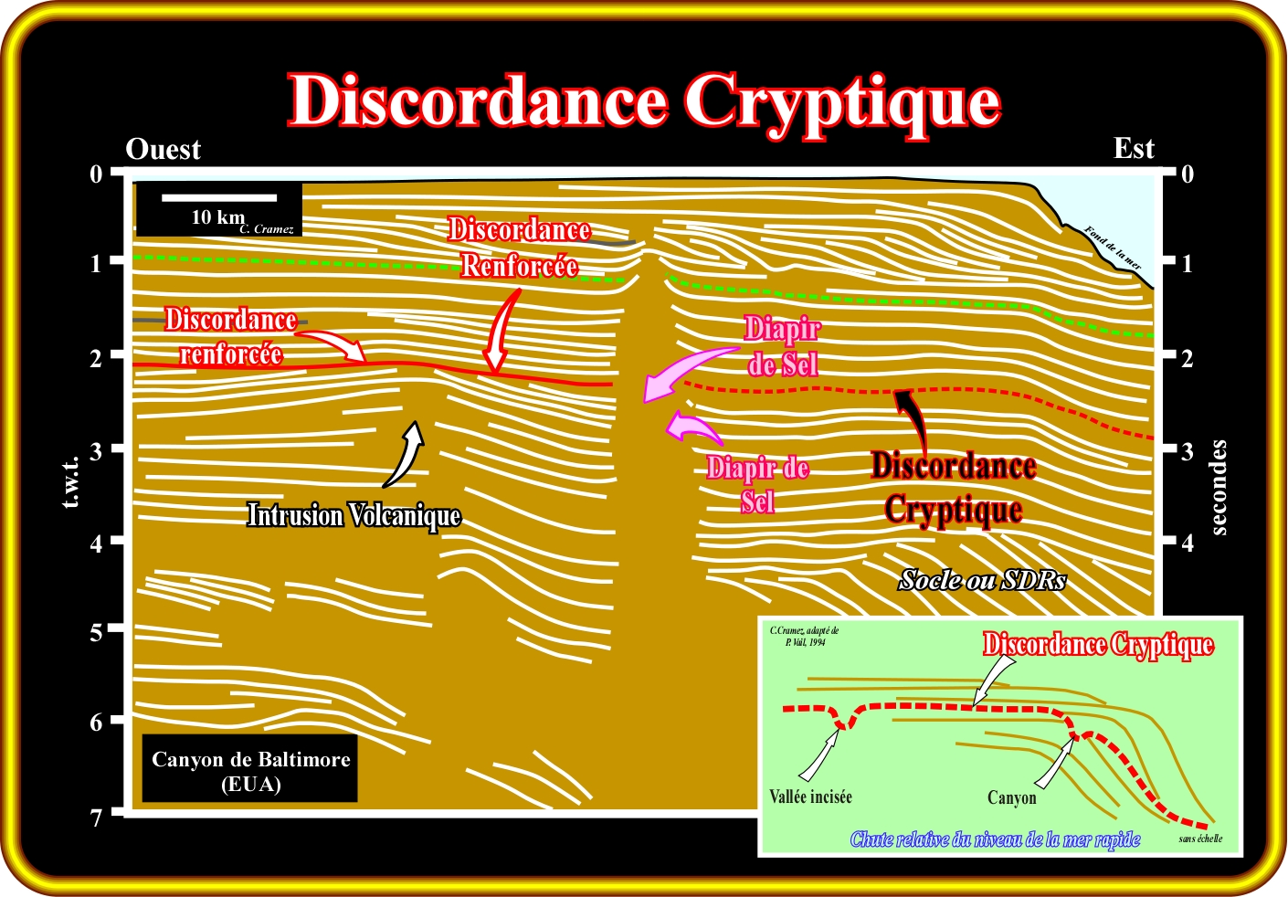 Toutes les discordances, non renforcées par la tectonique, c'est-à-dire, toutes les discordances, qui ne sont pas angulaires, sont cryptiques, autrement dit, difficiles à reconnaître et, en particulier, de suivre soit dans les lignes sismiques soit sur le terrain. Ceci est, particulièrement, vrai dans l'absence de vallées incisées et canyons sous-marins, comme illustré sur le modèle géologique (partie inférieure droite de cette figure). Ceci est, parfaitement, corroboré dans cette tentative d'interprétation géologique (ligne régionale de l'offshore du New Jersey, EUA). En effet, dans le secteur central de l'interprétation, une intrusion volcanique (corroboré par des puits d'exploration et magnétisme), très bien visibles sur les lignes parallèles, a déformé les sédiments sus-jacents créant un antiforme (structure extensive et non compressive comme un anticlinal). Plus tard, elle a été, partiellement, érodée due à une chute relative du niveau de la mer, qui a exhumée la plate-forme continentale et créé une surface d'érosion, c'est-à-dire, une discordance, qui marque le tope du Trias. On peut dire que régionalement, la discordance associée à cette chute relative est cryptique, comme on peut le voir, en dehors de la zone où la discordance n'a pas été renforcée par la tectonique, c'est-à-dire, par l'intrusion volcanique. Notons que l'intervalle progradant supérieur qui correspond au Cénozoïque, est souvent utilisé pour montrer l'importance de l'eustasie dans la stratigraphie, une fois que la subsidence induite par la tectonique est ici négligeable, ce qui signifie que tout l'espace disponible pour les sédiments (accommodation) a été créé par l'eustasie.