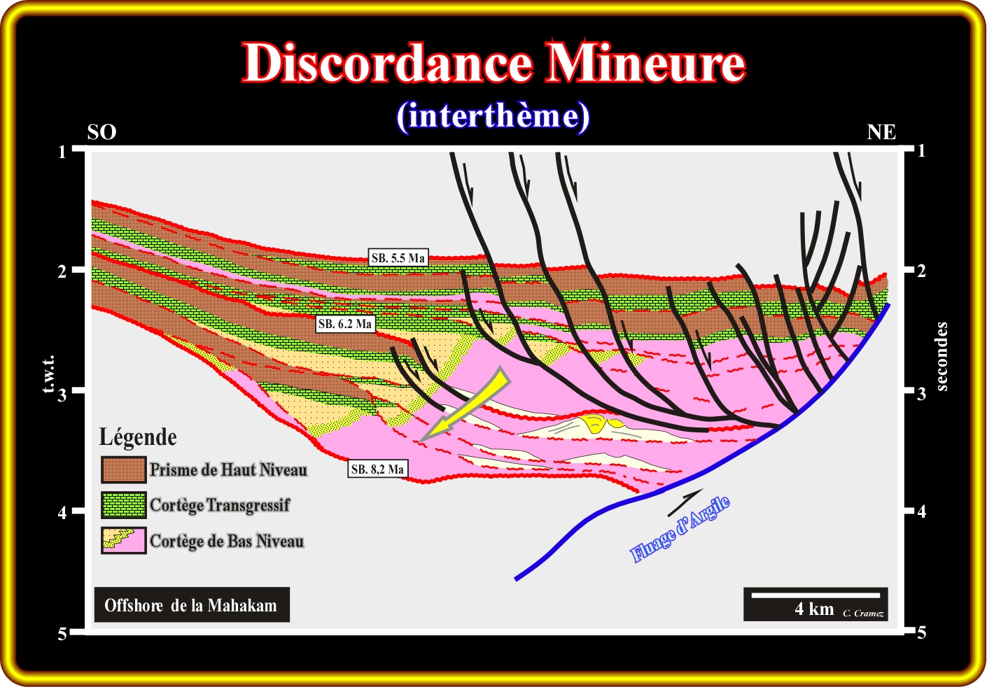 Comme indiqué par plusieurs géoscientistes, la réalité des ruptures de sédimentation à l'échelle globale reste très controversée. Récemment, Svetlana et al., 2008, ont compilé toutes les données sur la discordance entre le Jurassique et Crétacé, dans un certain nombre de régions avec styles sédimentaires et tectoniques différents. Ils ont conclu que la corrélation entre la discordance Jurassique-Crétacé et la courbe eustatique n'est pas évidente et ils pensent que la définition d'une discordance globale passe avant tout par une clarification de la courbe eustatique. Comme un grande nombre de géoscientistes travaillant dans les compagnies pétrolières, nous pensons qu'il y a des discordances globales qui se reconnaissent dans presque tous les bassins sédimentaires dans le monde. Un de ces discordances est, parfaitement, illustrée dans cette tentative d'interprétation d'une ligne sismique de l'offshore conventionnel du Cameroon. Dans cette tentative, il est facile de constater une importante chute relative du niveaux de la mer entre les dépôts profonds du Crétacé (cônes sous-marins du talus) et les dépôts de l'Oligocène Supérieur. Elle a induit une surface d'érosion majeure (aérienne ou sub-aquatique), autrement dit, une discordance qui se trouve non seulement dans les marges divergentes de type Atlantique, mais, aussi, dans les marges divergentes du type non-Atlantique (formées en association avec la formation des mégasutures). Avec cette discordance sont associés, dans parties profondes des bassins, des dépôts turbiditiques profonds (cônes sous-marins de bassin et de talus) qui permettent d'affirmer que l'âge, le plus probable, de la discordance d'environ 30 Ma. En fait, l'âge d'une discordance est donné par l'âge de l'hiatus minimum entre les dépôts des cycles stratigraphiques, que la discordance individualise. L'âge des couches pélagiques entre les cônes sous-marins donne l'âge de la discordance. Dans cet exemple, le puits d'exploration a traversé le remplissage d'un canyon sous-marin, mais d'autres puits ont traversé des cônes sous-marins associés avec la discordance.