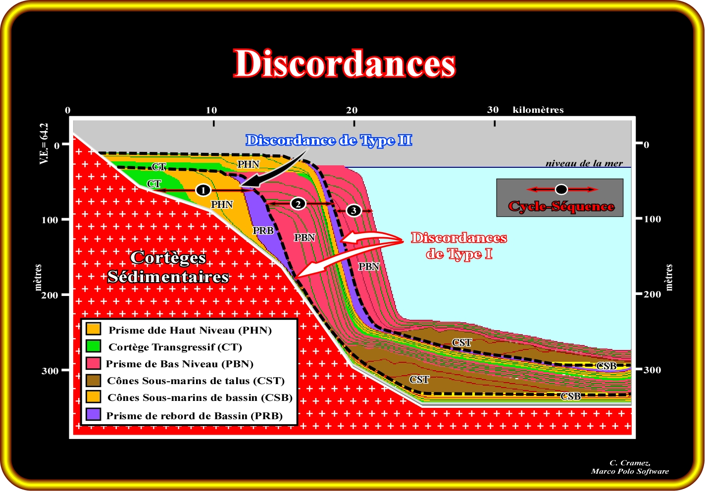 Dans la stratigraphie séquentielle, les cycles stratigraphiques : (i) Cycles d'empiétement continental ; (ii) Sous-cycles d'empiétement continental et (iii) Cycles-séquence, sont limités, dans le tope et base, par des discordances une fois qu'elles sont induites par des cycles eustatiques. Les discordances correspondent aux limites entre les cycles eustatiques qui sont définis entre les deux chutes relatives consécutives du niveau de la mer. Une discordance, quelle soit du tope ou de base (la discordance du tope d'un cycle est, nécessairement, la discordance de base du cycle sus-jacent) correspond à une surface d'érosion. Les paracycles (du cycle-séquence) qui ne doivent pas être considérés comme cycles, comme certains géoscientistes les considèrent, sont délimités par des surfaces d'inondation sans aucune chute relative du niveau de la mer eux. Les discordances sont caractérisées soit par des biseaux d'aggradation des sédiments sus-jacents, soit par biseaux sommitaux ou supérieurs (troncature ou non-dépôt) des sédiments sous-jacents. Toutefois, ces terminaisons des réflecteurs ne sont pas évidentes tout le long de la surface d'érosion, mais à des endroits particuliers comme les vallées incisées, rebord du bassin et partie supérieure du talus continental. Lorsque le niveau relatif de la mer chute, en général, il devient plus bas que le rebord du bassin (discordance type I), ce qui signifie que la ligne de côte, où les cours d'eau embouchent, se déplace vers la mer, parfois plusieurs dizaines de kilomètres. Ce déplacement de la ligne de côte détruit le profil d'équilibre provisoire des cours d'eau, qui sont forcés de creuser (inciser) leurs lits pour un nouveau profil d'équilibre provisoire soit atteint, ce qui signifie que l'érosion se fait de préférence le long des cours d'eau. D'autre part, en association avec la chute relative du niveau de la mer, des glissements de terrain et canyons sous-marins se forment, naturellement, près du rebord du bassin. C'est pourquoi qui est dans cette région que les discordances sont plus facilement mise en évidence.