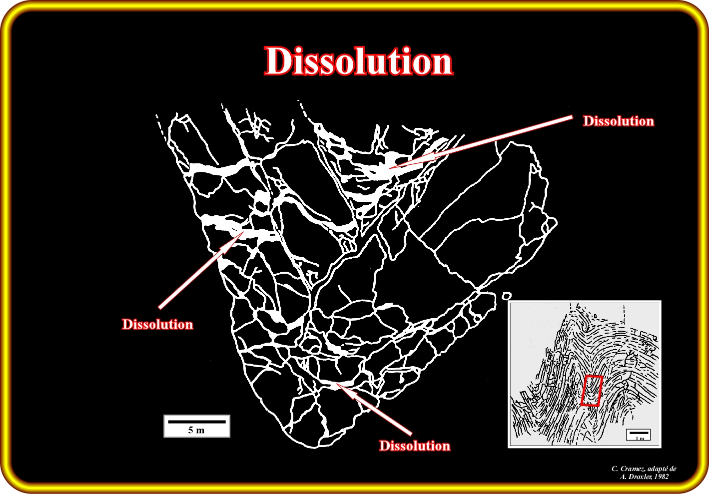 Dans les montagnes du Jura, en Suisse, où le faciès est, surtout, carbonaté, la dissolution est, parfois, un phénomène important, comme illustré dans cette figure (en blanc les fractures et les zones de dissolution). Cependant, l'échelle mésoscopique (échelle de l'affleurement, autrement dit, de la continuité) les structures anticlinales sont parfaitement concentriques et sans grande pertes par dissolution, comme on peut le constater dans le coin inférieur droit de cette figure. Dans certains cas, la dissolution peut atteindre plus de 30% du volume total de la roche, ce qui signifie que la loi Goguel qui dit que pendant la déformation, le volume des roches est, plus ou moins, constant (en tenant compte de la diminution de volume induite par la compaction) doit être utilisé très prudemment. D'autre part, la quantité de matériel carbonaté perdue par dissolution durant la stylolithisation (formation stylolithes) peut, aussi, être important. En fait, tout mouvement différentiel, sous pression, est accompagné, presque toujours, par la dissolution et la formation (diagénétique) de stylolithes. Dans les formations carbonatées, mais aussi, quoique plus rarement, dans les formations gréseuses et quartzitiques, les géoscientistes estiment, plus ou moins, le volume de roche perdue par stylolithisation (parfois à partir de la déformation des fossiles) qui apparaît comme un événement de la stade initiale de la déformation. Comme la direction des stylolithes est parallèle à σ_1 (contrainte effective maximale) du régime tectonique qui a déformé la roche, pour calculer le volume perdu par dissolution, les coupes géologiques orthogonaux à σ_1 sont absolument nécessaires (pour transformer une loi tridimensionnel en bidimensionnel). Les phénomènes de dissolution sont, également, très fréquents et importants dans les bassins évaporitiques, où la dissolution de sel peut produire des structures très compliquées, comme celles décrites par Arbenz (1968) dans le bassin de Williston (Etats-Unis), qui ont été créées par une dissolution sélective du sel des évaporites Dévonien, qui a créé une subsidence compensatoire. Ce mécanisme, dans sa forme la plus simple, correspond à une lixiviation sélective d'une partie de l'intervalle salifère avec un effondrement du plafond ce qui crée de l'espace pour les sédiments (accommodation).
