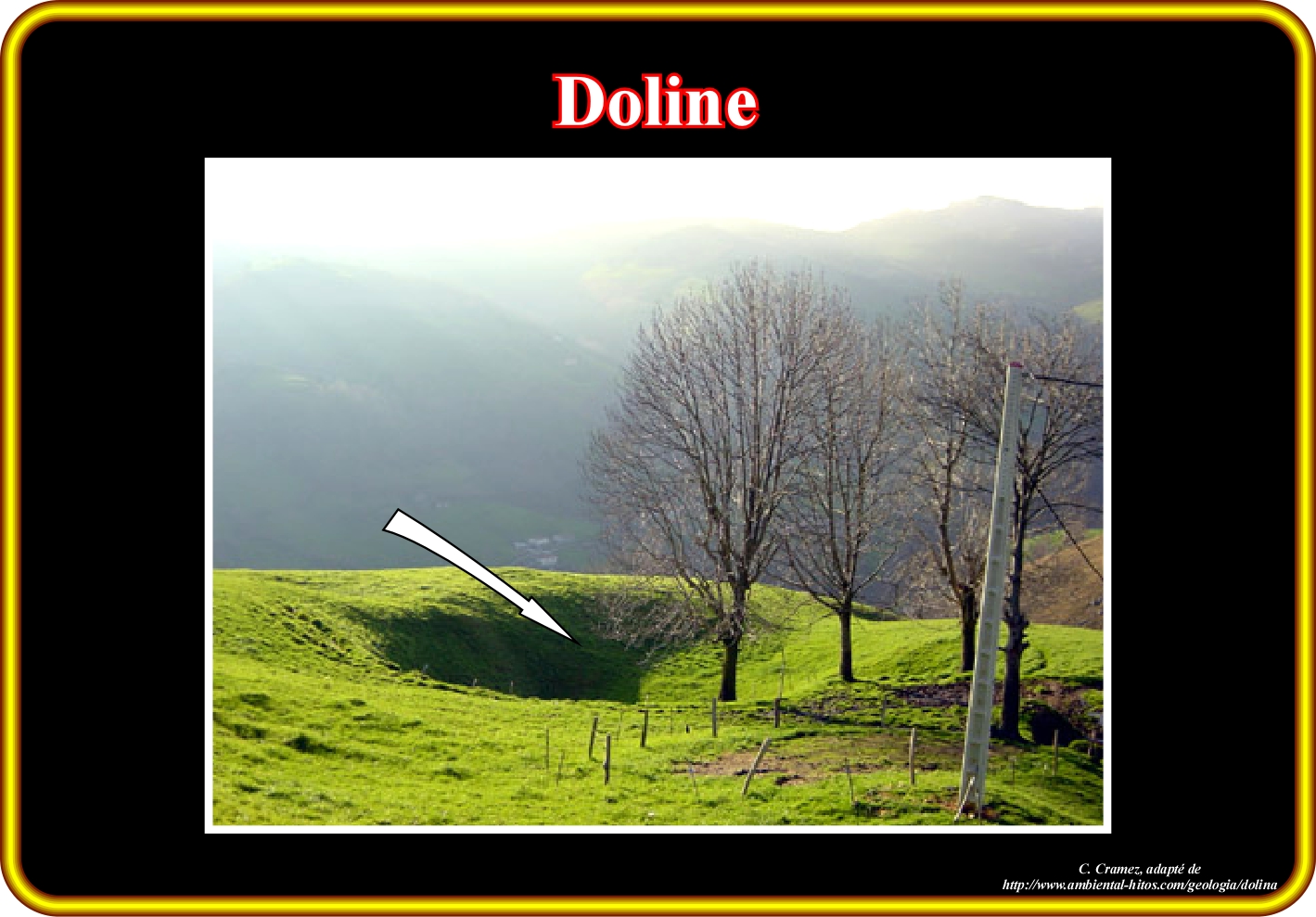 Dépression naturelle ou trou dans la surface topographique causée par rémotion, par l'eau, du sol ou de la roche sous-jacent ou des deux. Les dolines varient beaucoup en taille (de quelques centimètres à plusieurs centaines de mètres), soit en diamètre ou profondeur. La forme de dolines dépend, principalement, de la structure du sol et des roches dans lesquelles elles se forment.