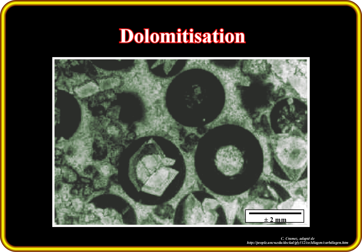 La dolomitisation est un processus par lequel un calcaire est altéré en dolomite (roche sédimentaire organogène composée de dolomite, calcite, avec des traces d'argile, quartz, pyrite et marcassite). En fait, quand un calcaire est mis en contact avec une eau riche en magnésium, la dolomite, minéral de carbonate de calcium et magnésium, CaMg (CO_3)_2, remplace la calcite (carbonate de calcium, CaCO_3), volume par volume. La dolomitisation implique une recristallisation à grande échelle. Les grains de dolomite, qui montrent, souvent, des faces cristallographiques très différentes ont, plus ou moins, une taille uniforme plus petite que celle des grains de calcite. Lorsque la recristallisation n'est pas complète, les cristaux de dolomie sont disséminés dans une matrice de calcite. Certaines roches calcaires présentent des taches de dolomie (couleur différente), que les géoscientistes interprètent comme le résultat d'une contamination locale par des eaux riches en magnésium. Les taches de dolomite, qui sont indépendants de la stratification peuvent, aussi, être le résultat d'une simple séparation à partir d'un mélange cristallin de carbonate de calcium et de carbonate de magnésium, c'est-à-dire, d'une précipitation locale de dolomie (CaMg(CO_3)_2. La dolomitisation est très commune dans sebkhas supratidales où les ions de magnésium, résultant de l'évaporation de l'eau, remplacent les ions de calcium dans la calcite et forment la dolomite. Comme le volume de la dolomite est inférieur à celui de la calcite, une dolomitisation implique une augmentation de la porosité d'environ 13%. Dans cette figure, on remarque la dolomitisation partielle de la calcite, dans un échantillon du Cambrien-Ordovicien de l'île aux ours (Spitzberg). Les ooïdes ont été remplacés par des euhèdres de dolomie. La rétention du caractère originel de la texture des ooïdes au sein de la dolomite est évidente. Dans cette lame mince la dolomie a été colorés avec du rouge d'alizari (nom commercial de la racine de rousse), ce qui donne des nuances plus foncées.