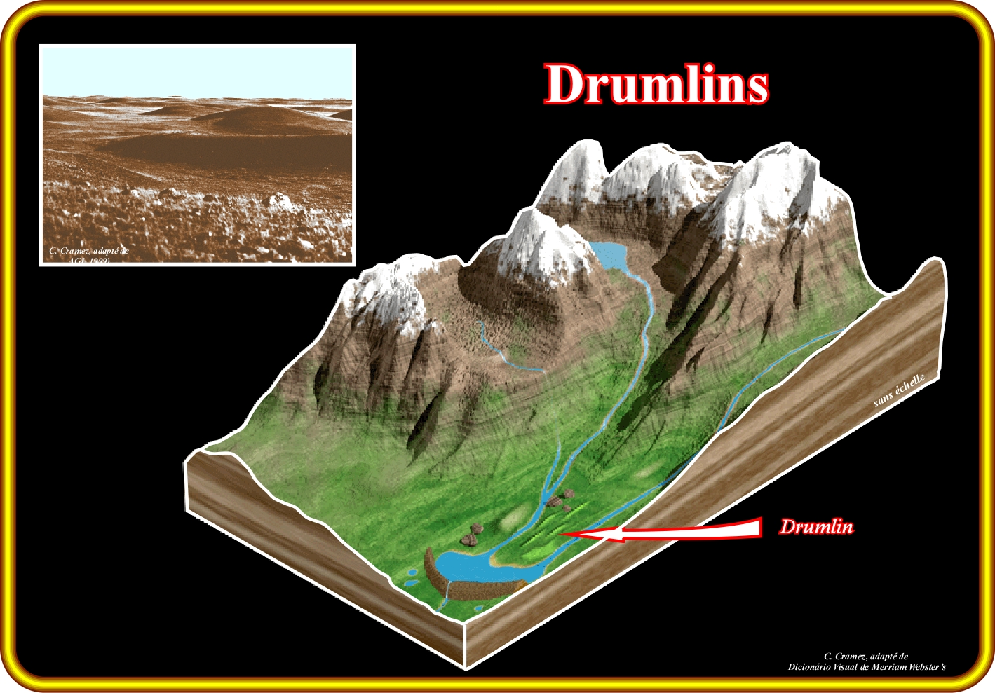 Comme illustré, un drumlin est un petit monticule formé par l'action glaciaire. Le grand axe est parallèle au mouvement de la glace et le côté plus raide du monticule est orientée contre le sens du mouvement. Ces structures peuvent avoir plus de 50 m de hauteur et plus de 1 km de longueur. D'autre part, elles sont composées de plusieurs couches qui se superposent avec un noyau essentiellement formé par un till glaciaire. Il y a plusieurs théories pour expliquer la formation des drumlins. Certaines considèrent comme les drumlins comme formé directement par la glace, tandis que d'autres considèrent que les drumlins sont le résultat d'inondations catastrophiques de l'eau hautement pressurisée qui coule sous la glace. Quoi qu'il en soit, les drumlins sont interprétées, principalement, comme une ondulation d'un cours d'eau. Cependant, on continue sans comprendre pourquoi certains glaciers ont des drumlins associés et pas d'autres. D'autre part, les drumlins sont, souvent, associés à des moraines arquées (ou moraines de Rogen, c'est-à-dire, moraines formées sous les glaciers), lesquelles ont une morphologie similaire aux ondulations de sable sur les plages. Ce type de moraines, qui comme indiqué, précédemment, apparaît en groupes ou champs, sont orientés perpendiculairement à l'écoulement initial de la glace, ce qui n'est pas le cas pour les drumlins qui sont orientés parallèlement à l'écoulement de la glace (dans le sens d'écoulement). En conclusion, on peut dire que l'asymétrie des drumlins indique la direction du mouvement de la glace. Le côté moins incliné (en aval), par opposition au talus escarpé, qui est dans le sens du mouvement. La hauteur d'un drumlin peut varier entre 8 et 60 mètres et la longueur peut dépasser le kilomètre. Dans certains cas, les drumlins sont disposés en groupes, plus ou moins, parallèles au mouvement du glacier comme c'est le cas dans le schéma illustré dans cette figure. N'oublions pas qu'aujourd'hui, il est encore difficile de comprendre si les sédiments ont été déposés directement avec la forme d'un drumlin ou si cette forme est le résultat de changements ultérieurs.