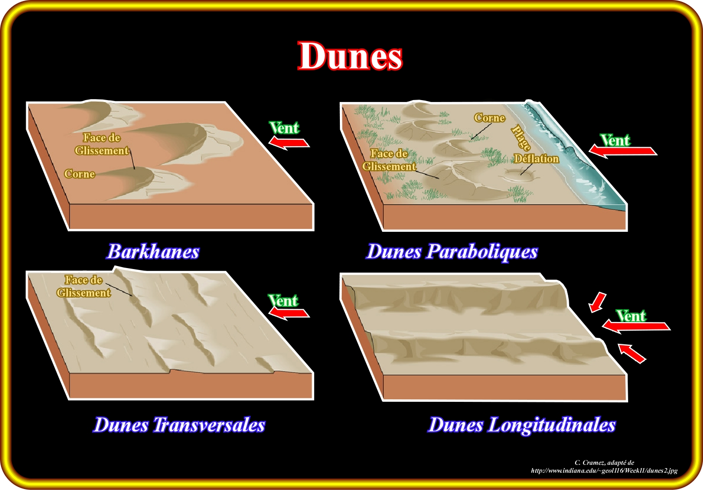 L'origine des dunes de sable est très complexe. Il y a trois conditions essentielles : (1) Un apport de sable meuble abondant dans une région, plus ou moins, dépourvue de végétation ; (2) Une énergie éolienne suffisamment importante pour déplacer les grains de sable et (3) Une topographie, dans laquelle les particules de sable puissent perdre leur énergie et se déposer. Plusieurs objets, tels que des arbustes, rochers, pierres ou piquets, peuvent s'opposer à la force du vent et provoquer l'empilement du sable dans de petits monticules et enfin dans les grandes dunes. Certains géoscientistes mentionnent des nids de fourmis peuvent former un noyau sur lequel les dunes de sable se développent. La direction et vitesse du vent, au-delà, de l'apport de sable, produisent une grande variété de formes et tailles des dunes. Le vent déplace, individuellement, les grains le long de la surface au vent jusqu'à ce qu'ils atteignent la crête, pour après glisser sur le côté sous le vent (face de glissement) et s'accumuler à la base envahissant, lentement, d'autres régions. Certaines dunes avec des crêtes de 30 m de haut peuvent avancer 50 m par an, ce qui est une menace pour les maisons, fermes et routes environnantes. Si la direction du vent est suffisamment uniforme, au fil des années, les dunes, progressivement, changent dans la direction du vent dominant. La végétation peut stabiliser une dune, empêchant son mouvement avec le vent dominant. Le long de la côte de certaines régions des États-Unis d'Amérique du Nord, des forêts entières peuvent se développer dans les zones dunaires. Parfois, des grandes tempêtes ou d'autres perturbations peuvent détruire le couvert forestier permettant que le sable des dunes adjacentes entre dans la zone perturbée. La structure et composition minérale des grains de sable qui forment une dune dépend de la géologie des montagnes qui ont été érodées par le vent et l'eau. Bien que la plupart des dunes soit composée de quartz et feldspath, les dunes blanches (White Sands) du Nouveau-Mexique sont composés de grains de gypse. Les fameuses dunes de sable noir des forêts tropicales des îles du Pacifique Sud sont faites de petites particules volcaniques. Les dunes de sable blanc des plages tropicales (récifs coralliens et atolls) sont composées d'une variété très brillant d'animaux microscopiques, algues, fragments de coraux, foraminifères, etc. (http://waynesword.palomar.edu/ww0704.htm#Introduction).
