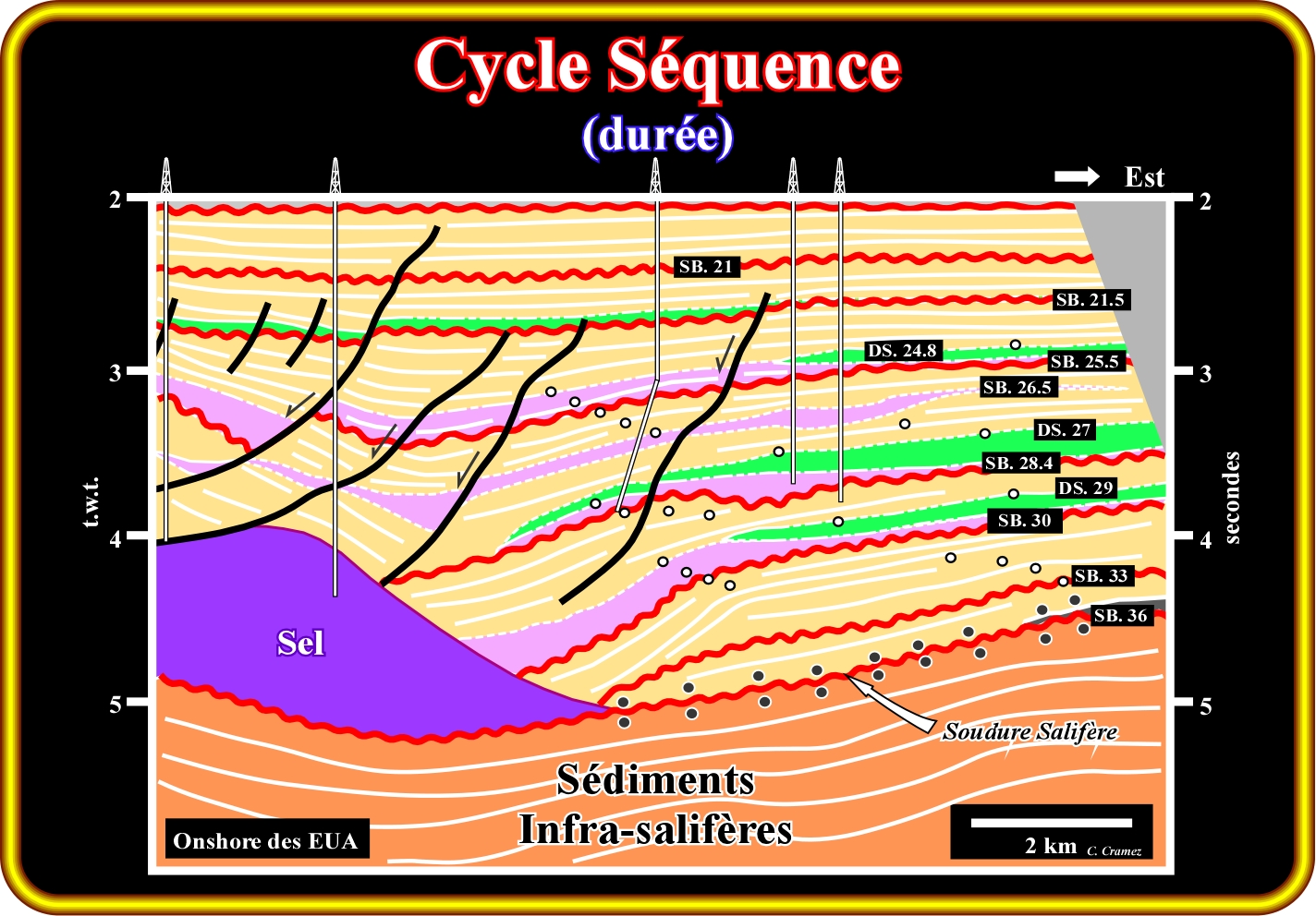 Dans cette tentative d'interprétation géologique de la ligne sismique de terre des Etats-Unis, il est facile de constater qu'elle a été faite au niveau hiérarchique des cycles stratigraphiques dits, cycles-séquence, car la différence d'âge entre les discordances qui limitent chaque cycle est inférieure à 3 - 5 My (millions d'années) et supérieure à 0.5 My. En fait, dans la stratigraphie séquentielle, chaque cycle stratigraphique est induit par un cycle eustatique, dont la durée permet de classer les cycles stratigraphiques en : (i) Cycles d'empiétement continental qui sont induits par des cycles eustatiques de première ordre, autrement dit, par des cycles eustatiques qui ont une durée de plus de 50 My ; (ii) Sous-cycles d'empiétement continental qui sont induits par des cycles eustatiques d'une durée variant entre 3-5 et 50 My (cycles eustatiques (de seconde ordre) ; (iii) Cycles-séquence qui sont associés aux cycles eustatiques dont la durée est comprise entre 0.5 et 3-5 My (cycles eustatiques de troisième ordre) ; (iv) Paracycles (du cycle-séquence), que certains géoscientistes appellent les cycles paraséquence qui sont associés à des montées relatives du niveau de la mer d'une durée comprise entre 0.1 et 0.5 Ma, mais sans chute relative entre elles ; (v) Cycles de haute fréquence qui sont induits par des cycles eustatiques de courte durée, généralement, de durée inférieure 0.1 My. Notons que dans les lignes sismiques conventionnelles qui ont une résolution d'environ 30-50 mètres, une interprétation en cycles-séquence n'est que possible dans les régions avec un taux de sédimentation très forte, de sorte que le cycle-séquence ait une épaisseur supérieure à la résolution sismique, comme c'est le cas illustré sur cette figure. Ceci est particulièrement important, une fois que uniquement dans les tentatives d'interprétation faites au niveau hiérarchique des cycle-séquence, c'est-à-dire, quand les cortèges sédimentaires peuvent être mis en preuve, est qu'on peut avancer ou prédire des lithologies. Dans tous les autres cas, quand un géoscientiste prédit lithologies, il en train de faire une erreur de "jeunesse" comme disent certains.