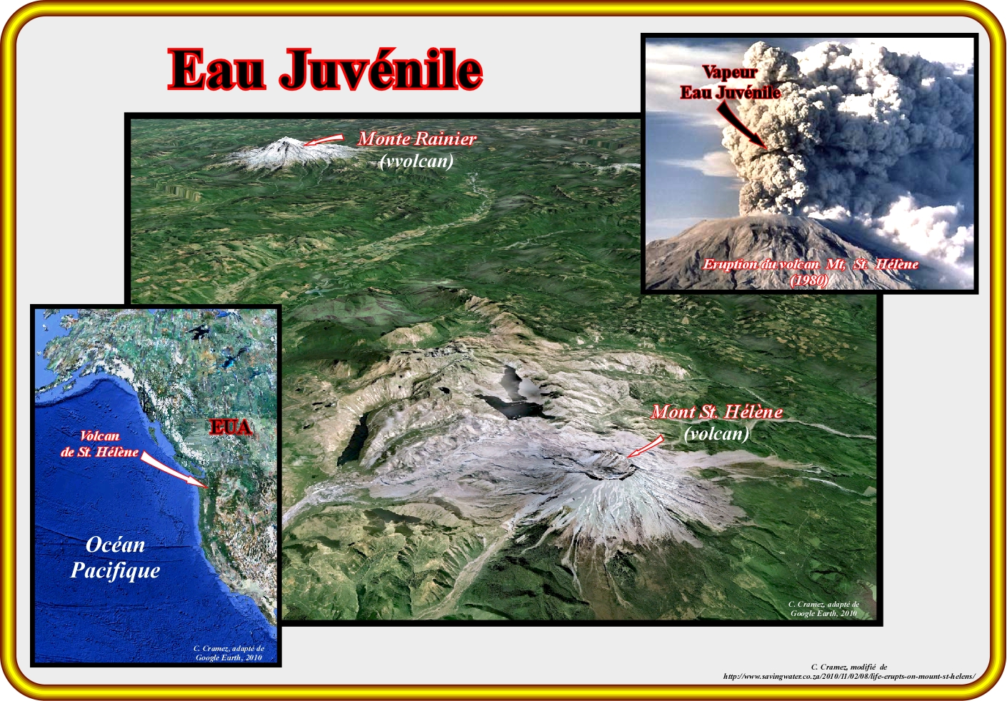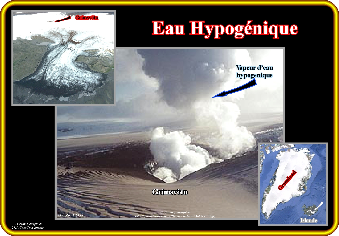 L'eau hypogénique ou juvénile, sous la forme de vapeur, est presque toujours associée à des éruptions volcaniques, comme le suggère cette photo, que illustre l'éruption de 1998 le long des fissures des lacs de Grímsvötn (Islande). Parfois, il est très probable que l'eau vient pour la première fois la surface de la Terre. Ceci est certainement vrai quand l'eau hypogénique ou juvénile est associée aux points chauds de l'asthénosphère. Mais actuellement, autrement dit, après 4,5 Ga (milliards d'années) d'histoire géologique, le plus probable est que l'eau ait été recyclée, de la même manière que les roches le sont, autrement dit, que l'eau ait déjà fait partie de la composition de la surface de la Terre. En fait, les zones de subduction, qu'elles soient de type B (Benioff) ou de type-A (Ampferer), suggèrent fortement une origine superficielle pour l'eau hypogénique. En fait, actuellement, la plupart des auteurs admet que : (i) Toute la croûte océanique paléozoïque a été consommée dans les zones de subduction (à l'exception d'une minuscule fraction qui se forme les ophiolite paléozoïques) et (ii) La croûte océanique postérieure à la Pangée, en particulier, celle formée au cours du Trias et du Jurassique, a également disparue dans les zones de subduction de type B (une petite quantité se trouve dans les chaînes de montagnes du Méso-Cénozoïque sous la forme d'ophiolite). Tout cela signifie que dans les zones de subduction de type-B, les plaques lithosphériques descendantes (croûte océanique et sédiments pélagiques profonds qui sont riches en eau) transportent l'eau vers les parties profondes de la zone de subduction où elle est avalée et assimilée par l'asthénosphère, tandis que les roches forment des nouveau magmas. La poursuite de cette histoire géologique est bien connu de tous les géoscientistes et surtout des personnes qui vivent le long des arcs volcaniques associés aux plaques chevauchantes. Les magmas, ainsi formés, remontent à la surface à travers la plaque chevauchante, la plupart des fois de manière catastrophique, et forment toute une série de roches effusives, au même temps qu'ils libèrent la plus grande partie de l'eau qu'ils contiennent. C'est cette eau que la majorité des géoscientistes appelle l'eau hypogénique ou juvénile.