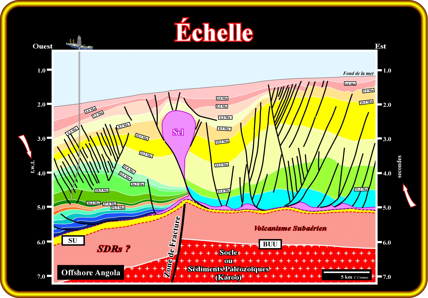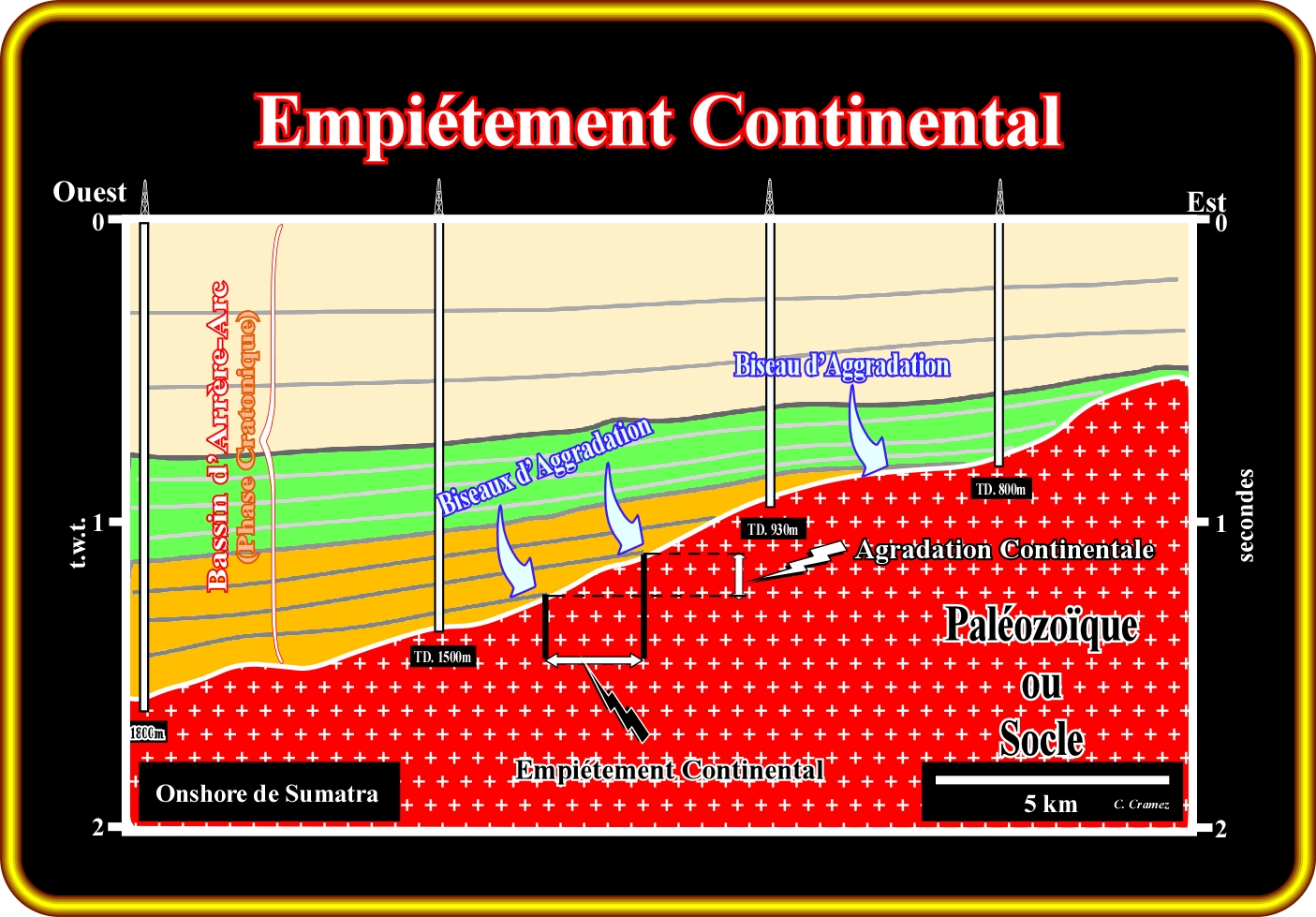 Dans cette tentative d'interprétation géologique d'une ligne sismique de l'onshore de Sumatra (bassin derrière l'arc induit par une subduction de type-B), les biseaux d'aggradation des sédiments cratoniques fossilisent la discordance qui limite supérieurement le substratum (sédiments paléozoïques et précambriens). Cette fossilisation du substratum est le résultat d'une montée relative du niveau de la mer, qui à chaque incrément, a déplacé la ligne de côte vers l'amont (Est), autrement dit, vers le continent. Considérant deux réflecteurs consécutifs, comme illustré dans ce schéma, il est facile de vérifier que la terminaison du réflecteur inférieur est plus basse et plus en aval que la terminaison du réflecteur suivant (supérieur). La distance entre les deux terminaisons, mesurée horizontalement, donne l'empiétement continental en mètres (l'échelle horizontale des lignes sismiques est métrique), tandis que la distance verticale entre les terminaisons donne de l'aggradation continentale en millisecondes, une fois que l'échelle verticale des lignes sismiques est en temps. Dans ce cas, l'aggradation continentale est positive une fois que la terminaison du réflecteur plus récent est par dessus de la terminaison du réflecteur précédent. Si la terminaison du réflecteur plus récent est plus basse que celle du réflecteur précédent, l'aggradation continentale est négative, ce qui suggère une discordance entre les deux réflecteurs, une fois qu'une partie du bassin a été soumise aux agents d'érosion. Connaissant la vitesse des ondes sismiques dans l'intervalle limité par les deux réflecteurs, le calcul de l'aggradation continentale est facile à déterminer. Lorsque l'empiétement continental est grand (par exemple, 100 km), pour une montée relative du niveau de la mer, par exemple, de 10 m, la topographie du bassin (géométrie de la discordance de la base du cycle-séquence considéré) est très plane, ce qui signifie que la profondeur d'eau est très faible et que sur les lignes sismiques, il est impossible de différencier la plate-forme continentale.