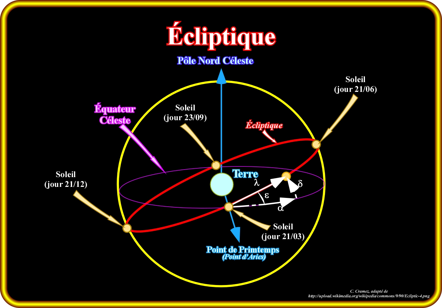 Au point de vue géocentrique, l'écliptique est le grand cercle sur la sphère céleste qui représente la trajectoire annuelle du Soleil vu de la Terre. Du point de vue héliocentrique, l'écliptique est l'intersection de la sphère céleste avec le plan de l'écliptique, qui est le plan géométrique contenant l'orbite terrestre autour du Soleil. La plupart des planètes du système solaire ont une orbite qui est légèrement inclinée sur le plan de l'écliptique. Le zodiaque (région du ciel autour de l'écliptique, divisée en 13 constellations, qui correspondent aux douze signes, qui quand vus de la Terre, le Soleil, Lune et planètes du système solaire se déplacent) est proche du plan de l'écliptique. Le plan de l'écliptique est incliné par rapport à l'équateur céleste d'un angle (inclinaison de l'écliptique) d'environ 23° 27'. Cet angle souligne l'inclinaison de l'axe de rotation de la Terre par rapport à la perpendiculaire au plan de son orbite. L'inclinaison de l'écliptique correspond à la position de la Terre sur son orbite à l'équinoxe du printemps et est le point de départ des mesures des angles de l'écliptique. Quant au plan orbital de la Lune, il est incliné d'environ 5° par rapport à l'écliptique. Puisque, il y a environ 365.24 jours dans une année et 360° dans un cercle, le Soleil semble se déplacer le long de l'écliptique, à une vitesse, plus ou moins, de 1° par jour. Ce mouvement d'Ouest en Est est contraire au mouvement apparent d'Est en Ouest sur la sphère céleste. L'écliptique et l'équateur céleste se croisent en deux points, directement vis-à-vis un de l'autre. Les équinoxes sont les moments où le Soleil se trouve dans ces points, ce qui signifie du point de vue héliocentrique, que la Terre est située sur l'un de ces points de son orbite. À ces moments-là, le jour et la nuit durent chacun environ 12 heures, partout sur Terre. L'une de ces intersections est appelé point vernal, qui correspond à la position de la Terre dans son orbite lors de l'équinoxe de printemps et est le point de départ pour mesurer l'angle de l'écliptique (point d'Aries est opposé au point de Libra). Le point sur l'écliptique qui est plus au nord de l'équateur céleste est appelé solstice d'été dans l'hémisphère Nord et solstice d'hiver dans l'hémisphère Sud. Ces noms sont inversés lorsque le soleil est plus au sud de l'équateur céleste.