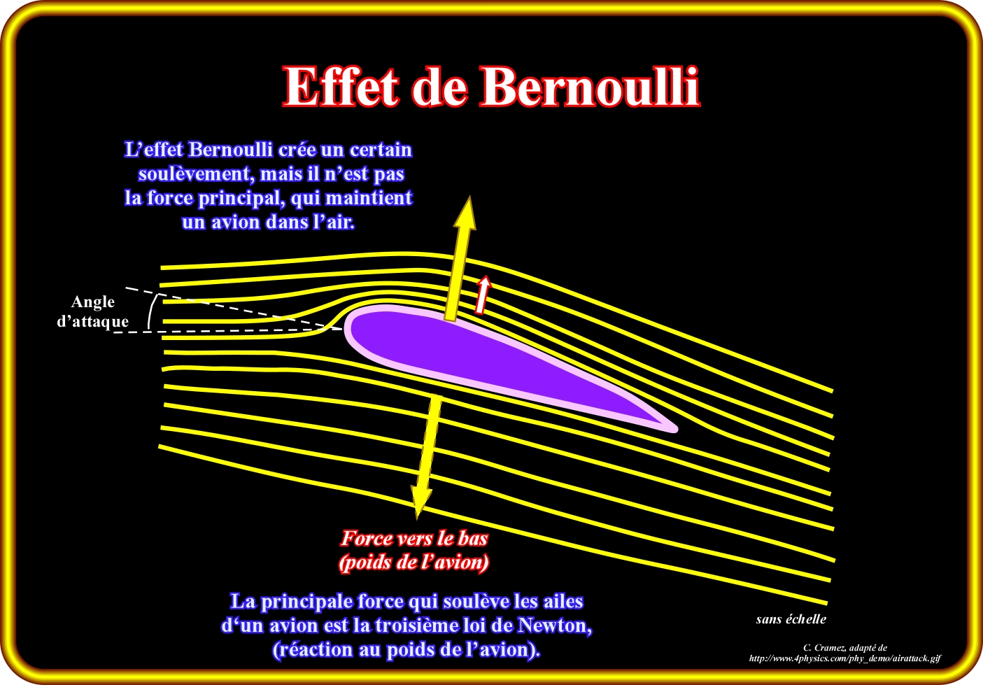 Comme illustré dans cette figure, l'idée fondamentale de l'effet Bernoulli, sur les ailes d'un avion, est la suivante : (i) Un courant d'air est divisé en deux parties quand il trouve les bords frontaux des ailes ; (ii) Une partie va vers le haut de la surface supérieure et l'autre vers le bas de la surface inférieure de chaque aile ; (iii) Cependant, pour que les courants se retrouvent en même temps, dans l'extrémité opposée des ailes, le courant d'air supérieur doit se déplacer plus vite que le courant inférieur, puisque la distance à parcourir est plus grande. Combinant les lois du mouvement de Newton et la loi de la conservation de l'énergie, Daniel Bernoulli (1700-1782) a montré que la pression exercée par un fluide (qui peut être un liquide ou un gaz) diminue lorsque la vitesse du fluide augmente. De ce fait, la pression verticale, vers le haut, des courants d'air qui se déplaçant sous les ailes d'un avion, est supérieure à la pression verticale, vers le bas, exercée par l'écoulement des courants d'air par dessus des ailes. Cela signifie que, dès qu'un avion prend de la vitesse, la différence de pression exercée par les courants d'air sur les ailes augmente, ce qui crée une force ascendante (force de décollement). Lorsque la différence de pression est suffisamment grande, la force décollement devient plus grand que la force de gravité (verticale vers le bas), forçant, ainsi, l'avion à décoller. C'est la force de levage qui maintient l'avion en altitude pendant le vol. Notons que quand un avion décolle d'un aéroport, il prend son envol dans des directions différentes en fonction des jours, et il fait la même chose lorsqu'il atterrit. En fait, le sens de l'atterrissage dépend de la direction du vent. L'avion décolle contre le vent plus facilement que dans le vent. C'est également l'effet Bernoulli qui augmente les flammes d'une cheminée et les attire vers le haut, quand une rafale de vent passe au-dessus de la cheminée, En fait, la vitesse du vent sur la cheminée diminue la pression de l'air ce qui facilite le mouvement vertical des flammes.
