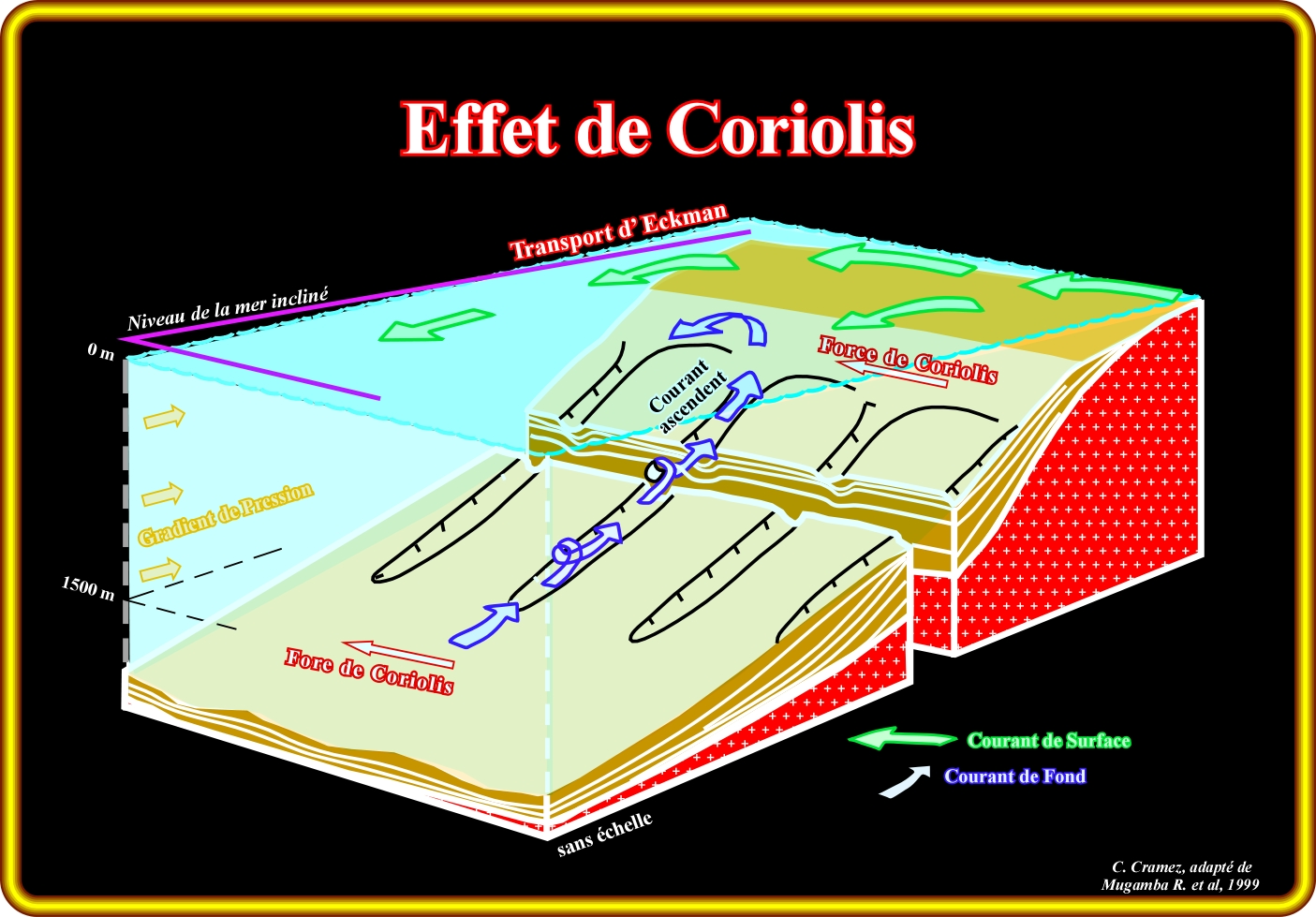 La force de Coriolis agit sur tous les corps, autrement dit, sur toute masse attachée à la rotation de la terre. Elle est maximale aux pôles, où un homme placé verticalement ne subit aucune force de rotation. Elle varie entre les deux pôles, déviant la trajectoire d'un corps en mouvement qui se déplace du nord vers le sud ou du sud vers nord. Quand une petite masse d'air commence à se déplacer sous l'influence des forces de pression, la force de Coriolis entre en jeu et détourne son chemin vers la droite si le mouvement se produit dans l'hémisphère Nord et vers la gauche s'il continue l'hémisphère Sud. Cette déviation de la trajectoire va se poursuivre jusqu'à ce que la force de Coriolis équilibre la force créée par les différences de pression. Dans ce cas, le vent suivra les courbes d’égale pression. Un tel mouvement, où la force de Coriolis équilibre les forces de pression, est dit être géostrophique. Ainsi le vent finira par s'écouler des zones de haute pression vers les zones de basse pression. Cependant, un autre facteur entre en considération, c'est-à-dire, la friction entre les masses d'air, ce qui détournera peu à peu, le vent et le tournera vers les basses pressions. Ce bloc diagramme illustre la formation de vallées sous - marines par des courants ascendants déviés vers la gauche (dans le diagramme) par la force de Coriolis. Les courants de fond sont créés par un gradient de pression produit par les courants de surface détournés par le mouvement de Eckman. Au fil du temps, les courants de surface, créés par le vent, se manifestant en profondeur, mais la vitesse et direction changent en raison de la force de Coriolis. La spirale de Eckman correspond à la configuration du mouvement du courant en profondeur. Le transport de Eckman correspond au mouvement du courant produit par le vent. Le mouvement de l'eau dans la spirale Eckman a une déviation de Coriolis de 90° de la direction du vent. Le long des zones côtières le transport Eckman peut produire des courants ascendants ou descendants qui éloignent ou rapprochent de la côte les courants de surface.