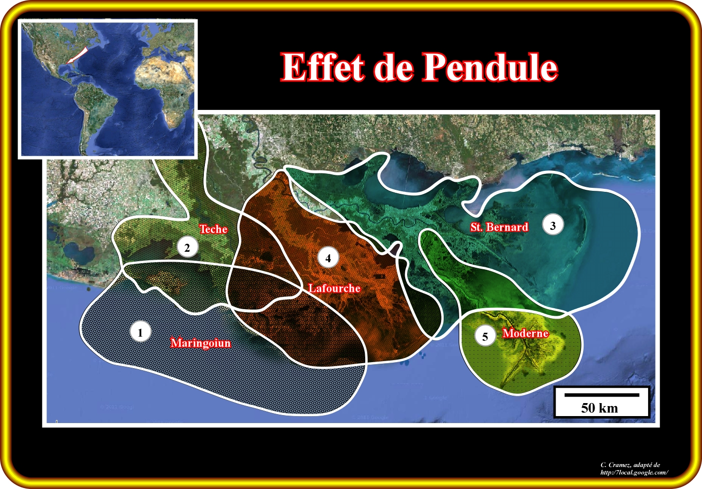 Comme illustré dans cette figure, les cours d'eau dits en - tresse ou anastomosés (entrelacées), comme certains géoscientistes disent, se développent, le plus souvent, en amont de la ligne de baie. Cette ligne, au moins dans la stratigraphie séquentielle, correspond à la rupture de l'inclinaison des lignes chronostratigraphiques que délimitent les dépôts alluvionnaires (en aval) des dépôts fluviaux (en montant). En fait, le long d'une ligne chronostratigraphique, qui, par définition, correspond à une surface de déposition, il y a plusieurs ruptures de pente. Ainsi, d'amont en aval, on peut reconnaître : (i) Rupture, qui met en évidence la ligne de baie ; (ii) Rupture côtière ; (iii) Rupture deltaïque ; (iv) Rupture continentale et (v) Rupture abyssale (limite entre le glacis du talus continental et la plaine abyssale). La première rupture limite des dépôts fluviatiles, dans lesquels l'influence des variations relatives du niveau de la mer n'ont, pratiquement, aucune influence dans la déposition, des dépôts de la plaine côtière qui sont partiellement influencés par les variations relatives du niveau des mers. La rupture côtière correspond, plus ou moins, à la ligne de côte. Ainsi, grossièrement, on peut dire qu'elle sépare les dépôts marins des dépôts la non - marins. La rupture deltaïque correspond, plus ou moins, la limite entre les sédiments du front du delta et les argiles de prodelta (notons qu’en français, argile peut être utilisée pour désigner la taille d'un particule sédimentaire mais aussi la roche formée par ces particules, ce que n'est pas le cas en d'autres langues). La rupture continentale correspond à la rupture distale de la plate-forme continentale, lorsque le bassin a une plate-forme. Quand le bassin n'as pas de plate-forme, autrement dit, en conditions géologiques de bas niveau marin, la rupture continentale correspond à la rupture distale de la plaine côtière. La rupture abyssale souligne le début de la plaine abyssale. C'est à partir de cette rupture qu'on retrouve les cônes sous-marins profonds (de bassin et de talus).