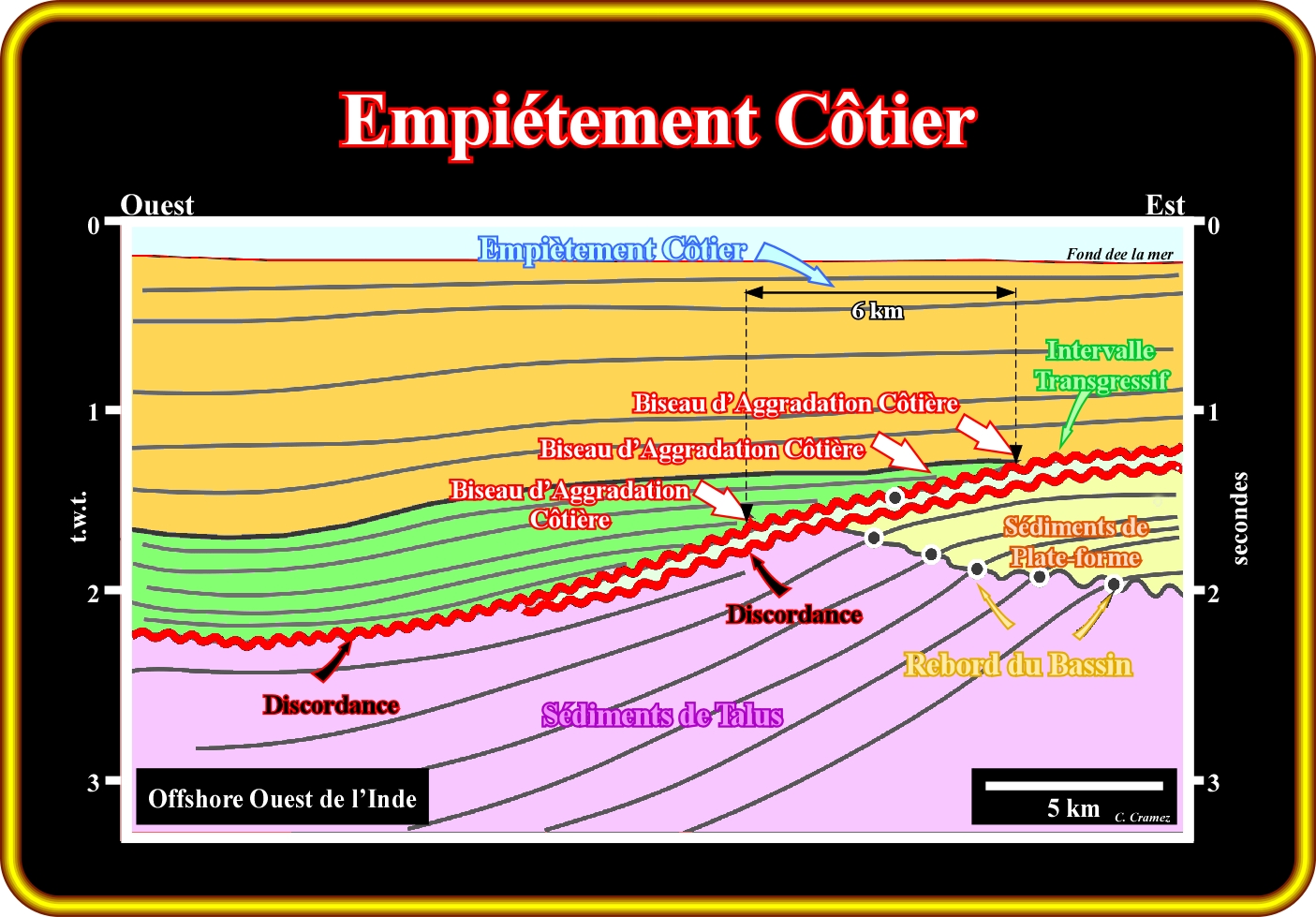 Un empiétement côtier est un cas particulier de l'empiétement continental. Il correspond à la distance horizontale (mètres) entre deux biseaux d'aggradation côtiers consécutifs. Un empiétement marin correspond à la distance horizontale (mètres) entre deux biseaux d'aggradation marins. La combinaison de l'empiétement et aggradation côtière (distance verticale en millisecondes entre deux biseaux côtiers consécutifs) suggère la topographie de la discordance contre laquelle les sédiments reposent. Si aggradation côtière est faible (± 50 millisecondes) et l'empiétement très grand (plus de 50 km), la morphologie de la surface d'érosion, créé par la chute relative du niveau de la mer, est très plate et sur les lignes sismiques, il sera difficile de séparer la rupture côtière d'inclinaison de la surface de déposition du rebord du bassin (pendant les cortèges de haut niveau, autrement dit, le cortège transgressive et le prisme de haut niveau). Dans le prisme de haut niveau (épisode régressif, puisque le niveau relatif de la mer monte en décélération), à partir d'un certain moment, la rupture d'inclinaison de la surface de déposition coïncide avec le rebord du bassin, puisque le bassin n'a plus de plate-forme continentale. Dans cette tentative d'interprétation d'une ligne sismique de l'offshore de l'Inde occidentale, en haut du prisme de bas niveau (niveau de la mer plus bas que le rebord du bassin) l'empiétement côtier, est d'environ 6 km et l'aggradation de ± 200 ms (± 100 m à cette profondeur). Toutefois, dès que la montée relative du niveau de la mer change les conditions géologiques vers haut niveau, l'empiétement côtier de la 1re surface d'inondation est, probablement, supérieur à 100 km et l'aggradation inférieure à 100 ms. Cette augmentation de l'empiétement souligne la morphologie de la discordance sous-jacente et la localisation de l'ancien rebord du bassin. Le premier biseau d'aggradation du prisme de bas de niveau marque une aggradation négative induite par la baisse relative du niveau de la mer qui a créé la discordance.