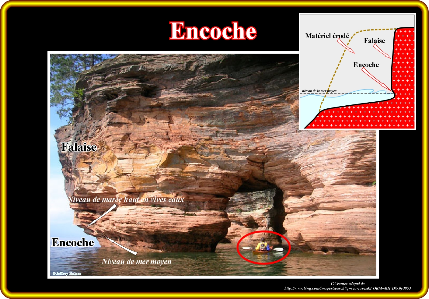 Dans cette figure, une encoche (sape) est clairement visible sous une falaise composée, principalement, par des roches dures. Le niveau de la marée haute en vives eaux (qui survient durant la syzygie) correspond probablement le sommet de l'encoche (surplomb ou encorbeillement). La partie inférieure (mal visible) peut être considéré comme une plate-forme avec des vasques et mares embryonnaires ou une plate-forme avec vasques incrustées d' algues calcaires. Le niveau de marée basse en mortes eaux, où abondent les tubicoles qui couvre l'encoche submersible, est recouverte par la mer. La topographie des régions côtières est principalement le résultat de mêmes forces qui façonnent la surface de la Terre : (i) Érosion ; (ii) Dépôt ; (iii) Soulèvement tectonique et (iv) Subsidence. L'action des vagues, comme illustrée dans cette figure semble le plus important agent d'érosion le long des côtes, en particulier, pendant les tempêtes. En fait, quand une vague cogne une falaise, le choc peut exercer une pression de plus de 100 kg/m^2. Ainsi, lorsque l'eau des ondes (de translation) pénètre dans les fractures des roches, elle comprime l'air à l'intérieur des fractures, lequel fonctionne comme un coin et élargie les fractures tournant la roche plus fragile. D'autre part, quand les roches sont carbonatées, la dissolution joue un rôle important, puisque l'eau de mer (salée) a une action chimique plus forte que l'eau douce. Cependant, en général, le processus d'érosion plus efficace est sans doute l'action abrasive du sable et gravier transporté par les vagues. Ces agents d'érosion agissent comme la charge de base d'une cours d'eau, avec la différence qu'au lieu de former un chenal vertical, comme dans les rivières, le sable et le gravier transporté par les vagues agissent horizontalement formant des encoches et corniches dans la base des falaises, qui peut être suspendues ou assises sur des arcs. Dans ce dernier cas, l'encoche prend la forme de grottes ou cavernes, comme c'est souvent le cas dans les plages du sud du Portugal. Notons que dès qu'une falaise s'effondre due à la croissance d'encoches, les débris rocheux sont éliminés par l'action des vagues. Cependant, le travail de sape (sapement) continue à faire reculer la falaise, créant ainsi une plate-forme par abrasion des vagues.