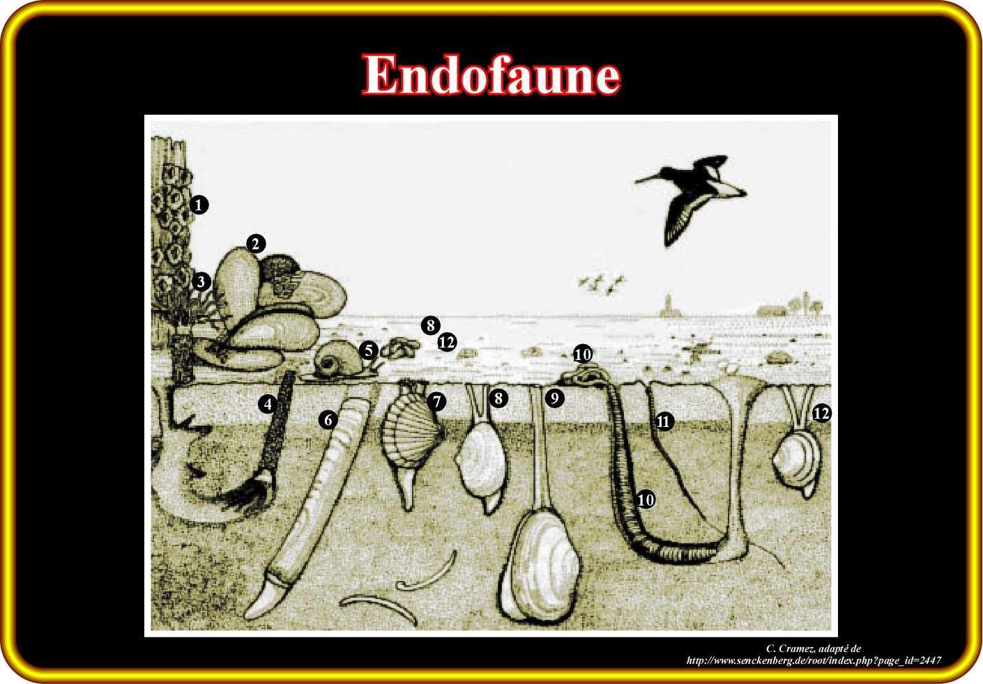 Comme indiqué ci-dessus l'endofaune sont des benthos qui vivent enterrés dans le fond de la mer. Les bactéries (microbes unicellulaires allongés (bacilles), sphériques (coccus), ou en spirale, sans membrane nucléaire et qui se nourrissent selon le mode végétal) et les micro - algues peuvent aussi vivre dans les interstices des sédiments des fonds marins. En général, l'endofaune animale devient, progressivement, plus rare, au fur et à mesure que la tranche d'eau et la distance à la côte augmentent. Au contraire, la quantité de bactéries reste plus ou moins constante (environ un milliard de cellules par millilitre d'eau interstitielle). Bien que le terme faune recouvre les animaux vivants d'une région à une époque géologique donnée (flore est le terme pour les plantes), très souvent, on utilise des termes tels que, macrofaune, pour décrire les organismes benthiques (organismes que vivent dans le fond de la mer) et qui ont au moins un millimètre de long, tandis que la mégafaune est le terme qui englobe tous les grands animaux d'une région particulière en un temps géologique donné. La méiofaune comprend les invertébrés benthiques qui vivent en milieu marin ou en eau douce. Ce terme, plutôt qu'un groupe taxonomique, définit, surtout, un groupe d'organismes plus grands que ceux de la microfaune et plus petits que ceux de la macrofaune. Pratiquement, ces organismes passent dans une maille de 1 mm, mais sont piégés dans une maille de 45 mm, bien que les dimensions exactes de la maille varient selon les auteurs. La mésofaune est formé par les invertébrés macroscopiques, par exemple, des arthropodes, tandis que la microfaune comprend tous les petits animaux ou microscopiques comme les protozoaires. Dans ce schéma du fond de la mer on reconnaît une endofaune formé par : (1) Bernacle ou bernache (anatife, pousse-pieds) ; (2) Moule bleue ou commune (Mytilus edulis) ; (3) Polychète lanice conchilega ; (4) Polychète koren Lagis ; (5) Escargot littorina littorea ; (6) Ensis americanus (couteau de l'Atlantique) ; (7) Bivalve cerastoderma edule (coque blanche) ; (8) Scrobicularia plane dit lavignon ; (9) Bivalve mya arenaria ; (10) Polychète arenicola marina ; (11) et Polychète hediste diversicolor ; (12 ) Bivalves macoma baltique.