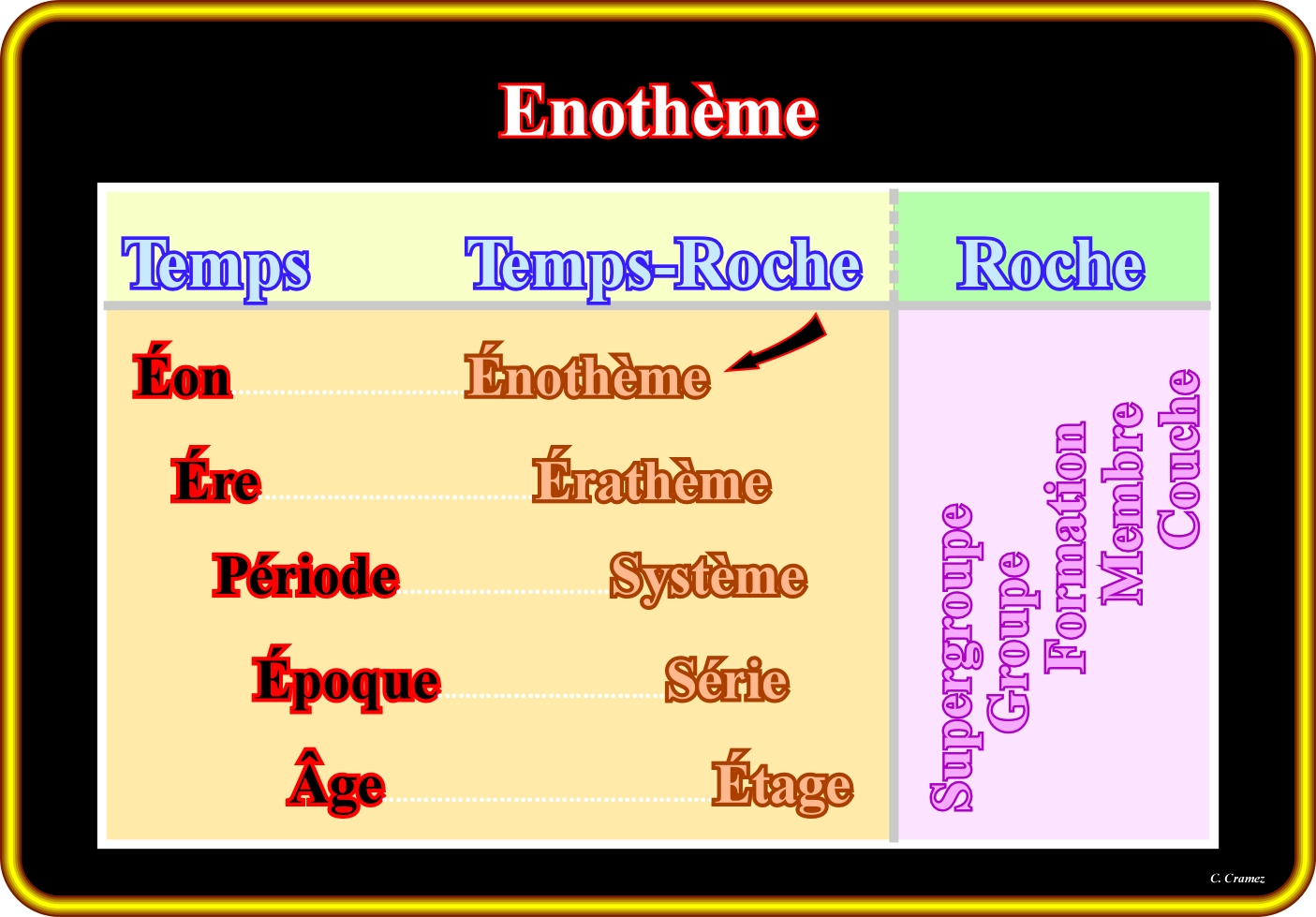 La plus grande unité stratigraphique dans l'histoire de la Terre. En fait, il y a trois principaux énothèmes, qui se composent de erothèmes. À son tour, les erothèmes sont constitués de systèmes, qui se composent de plusieurs séries et celles-ci par des étages.