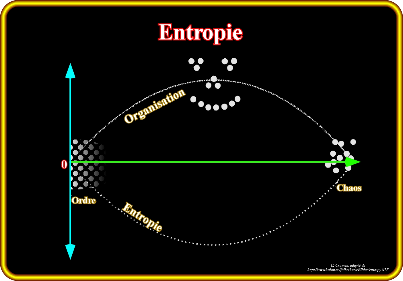 Parfois considérée comme le désordre du système, mais peut, aussi être définie en termes de déséquilibre. Ainsi, un système avec une faible entropie a un déséquilibre très important ou des différences d'énergie entre les différentes parties du système. Dans un système avec une grande entropie, les différentes parties du système sont en équilibre, une fois qu'elles ont, plus ou moins, le même niveau d'énergie et par conséquent peu de travail peut être fait, puisque l'énergie ne peut pas s'écouler d'un lieu à un autre.
