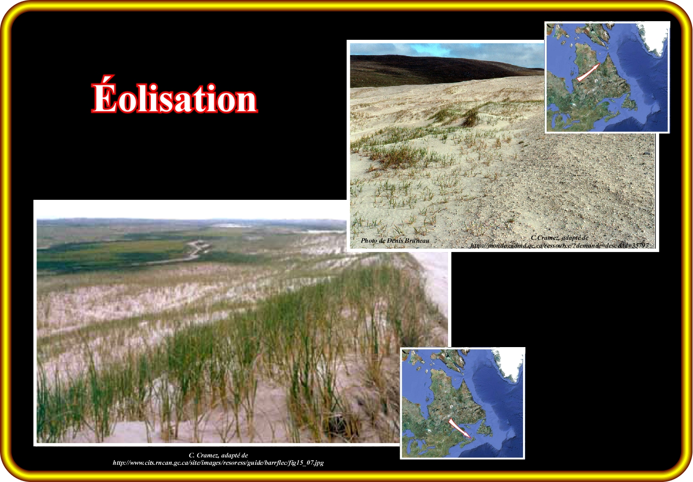 Cailleux (1942) a proposé une méthode d'analyse morphologique des sables. En fait, se basant sur la forme et l'aspect des grains de quartz, il a distingué quatre types fondamentaux : (i) Non usé (NU), autrement dit angulaires ; (ii) Polis brillant (PB), ce qui suggère un grand et long travail dans le milieu aquatique ; (iii) Arrondi propre (AP), c'est-à-dire, usés par le vent et (iv) Arrondi sale (AS), des grains éoliens anciens retravaillés. En établissant pour un échantillon donné, le pourcentage de chaque type, on peut déterminer l'histoire des grains et par conséquent, les actions qui se sont exercées sur eux. Cependant, le résultat d'analyse doit être bien interprété. Certains sables, principalement, composés par des grains non - usées (NU) peuvent être marins, provenant d'un sable récemment désagrégé dont les grains n'ont pas encore d'usure. Également, un sable contenant une grande quantité de grains polis brillants (PB), peut dériver d'un matériau marin plus ancien. Comme indiqué plus haut, l'éolisation peut produire des formes caractéristiques telles que : 1) Roches en champignons (blocs rocheux en forme de champignon ou de table, qui semble être liés à l'abrasion des courants de ressac, dans la zone intertidale, ou à l'érosion éolienne dans les régions désertiques ; c'est un indicateur du niveau moyen de la marée haute) ; 2) Taffonis (configuration des roches gréseuses ou cristallines, caractérisé par le creusement de cavités sphériques, par déflation des éléments désagrégés par altération sous-cutanée, due à la corrosion des roches par l'embrun); sa répartition géographique est zonale, c'est-à-dire, ils se forment dans tous les littoraux gréseux du globe, dans une position exposée au vent et en régions semi - arides ; 3) Alvéoles ; 4) Stries ; 5) Ventifactes (cailloux façonnés par la corrasion et déflation éolienne, avec des arêtes pointues, dont le nombre dépend de la position que les cailloux prennent face au vent et des surfaces picotées ou polies (poli éolien), sur la partie exposée au vent, qui apparaissent sur les plages, déserts, etc.