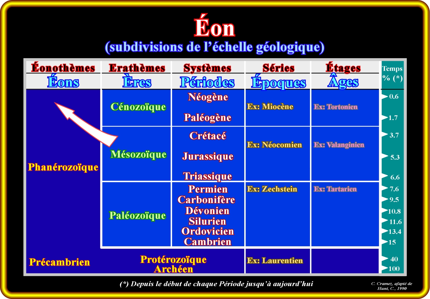 Dans cette échelle géologique modifiée de Hunt (1990), le plus ancien Éon est l'Archéen. Beaucoup de géoscientistes divisent l'Archéozoïque en Hadéen et Archéen et considèrent quatre éons dans l'histoire géologique : (i) Hadéen ; (ii) Archéen ; (iii) Protérozoïque et (iv) Phanérozoïque. Le Précambrien, pour certains géoscientistes est un super-éon et correspond à l'ensemble de l'Archéen, Archéozoïque et Protérozoïque, tandis que d'autres considèrent avant l'Hadéen, le Cryptozoïque (Gamovien et Plankien). Dans cette échelle géologique, la dernière colonne représente le pourcentage du temps depuis le début de chaque période géologique (équivalent temps du système, c'est-à-dire, des roches) jusqu'à aujourd'hui. Ainsi, en supposant que la base de l’Archéen représente l'âge de la Terre (100 %), le Néogène représente 0.6% de l'âge total de la Terre. Concevoir de manière abstraite et intellectuel le temps est très simple. Tout le monde sait combien de zéros doivent être attachés au nombre dix pour représenter des millions d'années. En revanche, assimiler une telle période de temps est beaucoup plus difficile. Tous les enfants aujourd'hui savent que les dinosaures ont disparu il y a environ 65 My, mais ils n'ont aucune idée de que cela représente. La notion du temps géologique est si étrange qu'elle ne peut être comprise qu'à travers de métaphores. « Imaginons le yard, la vieille mesure anglaise, qui est, plus ou moins, la distance entre le nez et l'extrémité de la main, une fois étendue. Si cette distance (± 91 cm) représente l'âge de la Terre, un simple coup de lime sur le pouce est suffisant pour éliminer toute l'histoire de l'humanité (McPhee, J., 1980). » « L'homme est ici sur Terre depuis il y a environ 32 000 années. Qu'il y ait fallut 100 millions d'années pour préparer le monde pour lui est la preuve que l'homme a été fait pour vivre ici. Je suppose, mais je ne sais pas. Si nous prenons la Tour Eiffel à Paris pour représenter l'âge du monde, la pellicule de peinture qui tout là-haut, protège le tope du pinacle représente la portion humaine de cet âge et ce qui est évident pour tout le monde, c'est que la tour Eiffel a été construite uniquement pour cette mince pellicule de peinture puisse être là. C'est ce qui possible, mais je ne le sais pas (Mark Twain, 1903). »