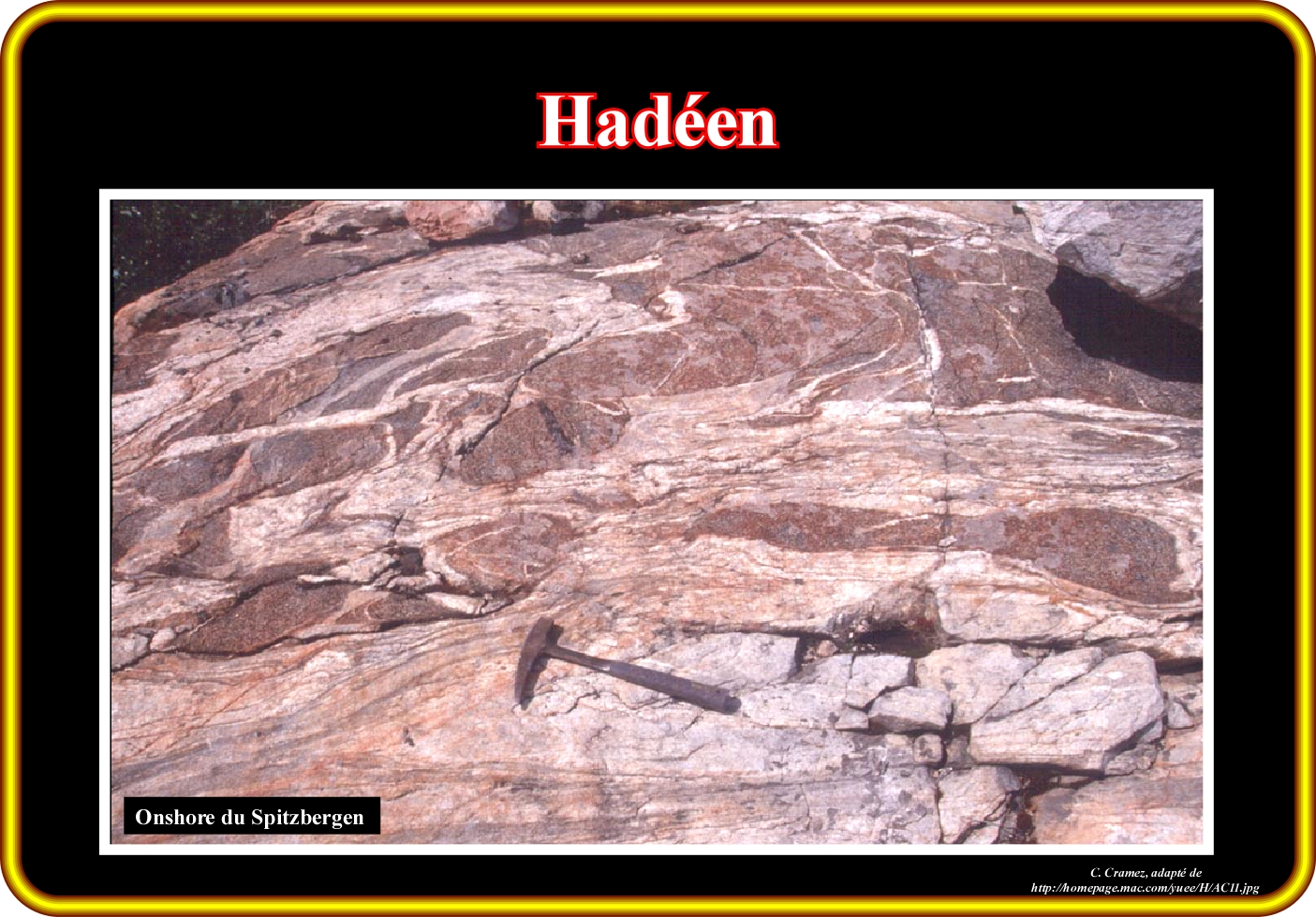 Les roches illustrées sur cette figure sont des plus anciennes de la Terre (Précambrien), mais n'appartiennent pas à l'Hadéen, puisque cet éon, par définition, ne peut pas être représenté par des rochers, comme nous les définissons aujourd'hui. L'Hadéen est le plus ancien éon géologique de la Terre. Les appareils volcaniques ont été très abondant sur Terre. Également, les météorites étaient très fréquentes et ont produit des énormes cicatrices d'impact qui encore aujourd’hui, certaines d'entre elles peuvent être localisées de manière, plus au moins, indirecte. Certains géoscientistes considèrent la période Hadéen comme la période du temps Zen, une fois qu'il est défini par l'absence de roches. Ainsi, sa limite supérieure sera toujours reculé chaque fois que des roches plus anciennes seront découvertes. On peut dire qu'il n'y a pas de fossiles de cette époque. Basé sur des estimations de l'âge de la Terre, l'Hadéen a commencé à environ 4.56 Ga et s'est achevée vers 4.03 Ga (en tenant compte les roches) ou environ 0.40 Ga, tenant compte des plus anciens des cristaux de zircon. L'Hadéen n'est pas, encore, une unité géologique formelle de la Commission Internationale de Stratigraphie, une fois que sa définition, comme indiqué précédemment, ne peut être documenté et représenté par des roches. Avant l'Hadéen, le système solaire (et les corps constitutifs) ont fusionné à partir de la matière des générations précédentes de supernovae. La proto-Terre (comme presque tout) était une combinaison de morceaux de glace, roche, métal et matière carbonée visqueuse. Au cours de l'Hadéen, le pro-Terre s’est différencie, au moins, en un noyau métallique et manteau rocheux. La chaleur de cette différenciation a probablement été créé par l'impact de météorites, gravité et désintégration radioactive. Sur la base de la datation des astéroïdes, cette différenciation s’est faite en quelques dizaines de millions d'années. Dans les premiers 100 My après la différenciation, la proto - Terre a entrée en collision avec le Théia (hypothétique planète avec une taille similaire à la planète Mars). De cette collision, une partie du manteau, s’est détachée de la proto-Terre et entré en orbite, cependant sans eau ou d'autres éléments volatils. Certains géoscientistes pensent que c'est ainsi que s’est formé le satellite de la Terre, autrement dit, la Lune.