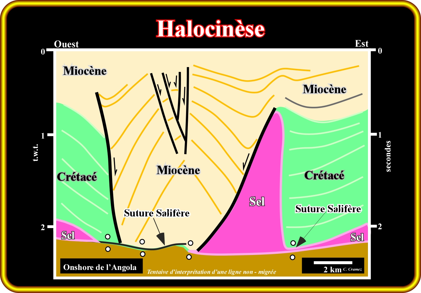 Cette tentative d'interprétation géologique d’une ligne sismique de l’onshore de l’Angola (Bassin de la Kwanza) , tirée dans les années 60 (ligne non - migrée) est approximativement la même que celle qui a été proposée par les géoscientistes de Petrangol (ancienne filiale de Petrofina, qui a été acquise par Total). En fait, dans les années 60 ans, les géoscientistes de Petrangol, qui travaillaient dans l'onshore de l’Angola (bassin de Kwanza) ont avancé l'hypothèse que certaines structures et, surtout, les variations d'épaisseur des intervalles sédimentaires, observés sur le terrain et sur les lignes sismiques pourrait uniquement s'expliquer par l’écoulement latéral et vertical de l'horizon salifère, qui avait été traversé par les puits d’exploration pétrolière forés à terre. Notons que les horizons salifères n’affleurent pas et que des énormes variations d'épaisseur des intervalles sédimentaires avaient déjà été décrites par les géoscientistes de la compagnie pétrolière Sinclair, qui ont travaillé dans le bassin de Kwanza entre 1904 et 1922. En fait, Brognon et Verrier (1966), et plus tard Masson (1972, ont expliqué la structure illustrée dans cette tentative d'interprétation (structure de Quenguela Nord), par un allongement minimum (absence d’un régime tectonique) et une réduction (écoulement) maximum de sel. Dans les années 90 ans, Duval, Cramez et Jackson (1992), en tenant compte de l’important raccourcissement (compression) des sédiments observés dans les parties profondes de l'offshore ont proposé un modèle complètement différent, autrement dit, un modèle basé sur un allongement maximum et une réduction minimale du sel. En effet, localement, c’est-à-dire, hors du contexte géologique régional, on peut dire que la structure antiforme de Quenguela, les variations dans l'épaisseur du Miocène et l'absence de Crétacé dans le noyau de l’antiforme peut être expliquée par deux modèles. Toutefois, en tenant compte du contexte géologique du bassin, les structures compressives observées dans les parties profondes ne peut s'expliquer que comme une contrepartie de l’allongement des sédiments dans la partie amont du bassin.