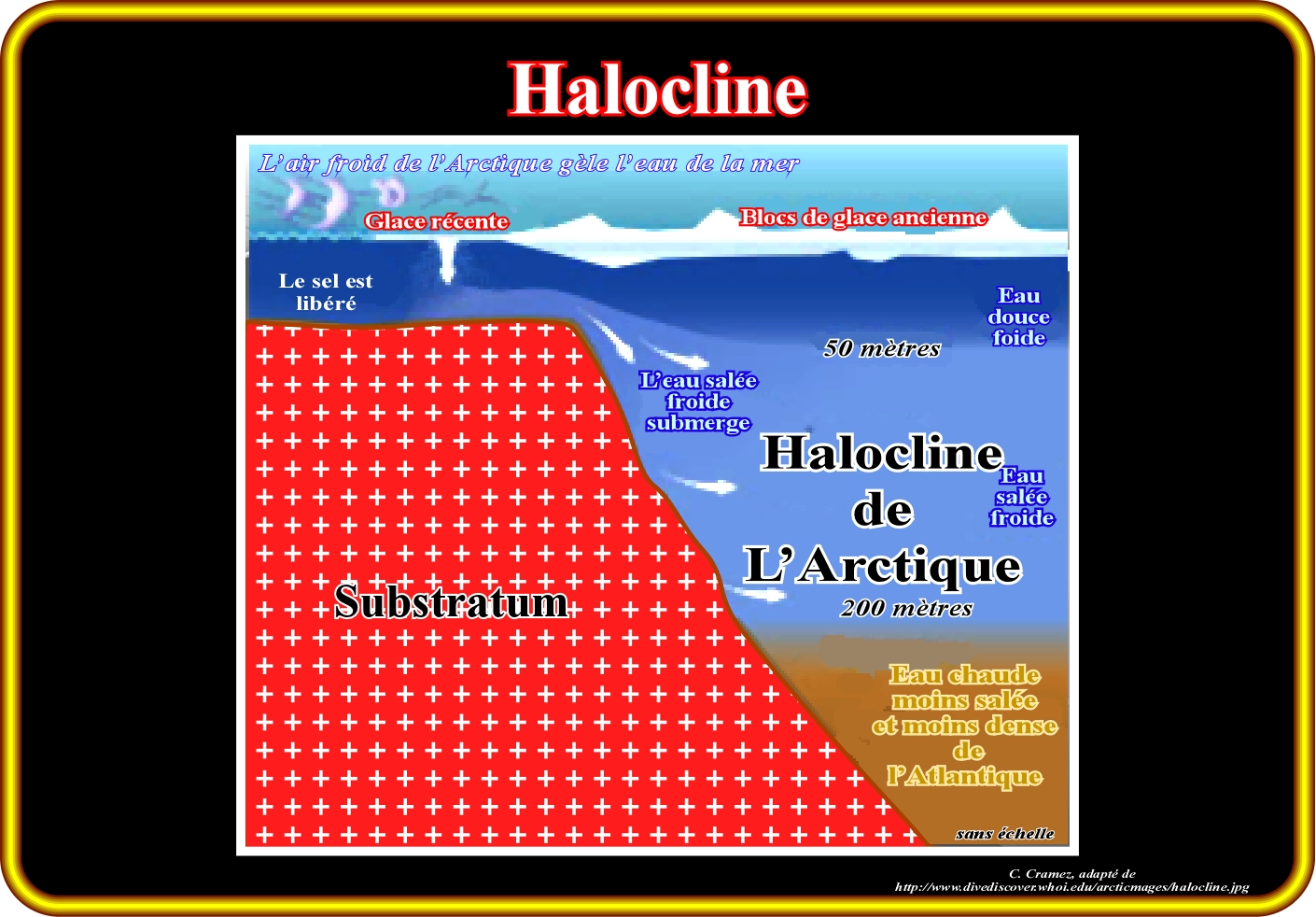 Comme indiqué ci-dessus et comme illustré dans ce schéma, l'halocline est une forte variation verticale de la salinité de l'eau. En effet, une augmentation de la salinité de l'eau de mer de 1 kg / m^3 produit une augmentation de la densité de l'eau d'environ 0.7 kg / m^3, ainsi, est la salinité, qui en grande partie, contrôle la stratification de l'eau de mer. En général, une eau salée plonge sous une eau moins salée, ce qui signifie que les haloclines plus salées sont en-dessous des moins salées. Cependant, il y a une exception importante, qui est illustrée dans cette figure, c'est-à-dire, l'halocline de l'océan Arctique, qui est plus froide et plus dense que l'eau chaude de l'Atlantique, qui est sous-jacente. Ainsi, on peut dire, que l'halocline de l’Arctique protège la fonte de la calotte polaire de l'eau chaude de l'Atlantique. En effet, dans les régions arctiques, quand se forme la glace à partir d'une eau relativement peu salée, le sel est libéré et va contaminer l'eau environnante, ce qui rend les eaux de surface plus salées et plus denses (voir figure). Ces eaux froides et salées plongent en profonde sous l'eau moins dense qui sous la calotte glaciaire (blocs de glace agglutinés) formant une halocline, autrement dit, signifie une zone, plus ou moins, épaisse de l'eau froide et dense (sel), qui agit comme une barrière entre les eaux de surface moins salées et froides et l'eau profonde plus chaude (moins salé et moins dense) de l'océan Atlantique. Lorsque l'eau pénètre dans l'Arctique de l'Atlantique par le détroit de Fram (passage de l'océan Arctique à la mer du Groenland et la mer de Norvège, entre le Groenland et Siptzberg), elle fait fondre la glace, ce qui rend la partie supérieure de l'Atlantique moins d'eau salée et plus froide, ce qui crée une halocline inférieure. Dans les régions de la Terre où l'évaporation est beaucoup plus importante que les précipitations, c’est-à-dire, dans les régions très chaudes, les eaux de surface deviennent plus salées que les eaux profondes, ce qui déstabilise l'halocline, une fois que la stratification est inversée. Il ne faut pas confondre l'halocline qui est simplement la région juste en dessous de la surface d'une étendue d'eau où il y a une augmentation ou une diminution de la densité de l'eau (due à la salinité), avec la thermocline, qui est la zone dans une étendue d'eau, qui marque une augmentation brusque de la température.