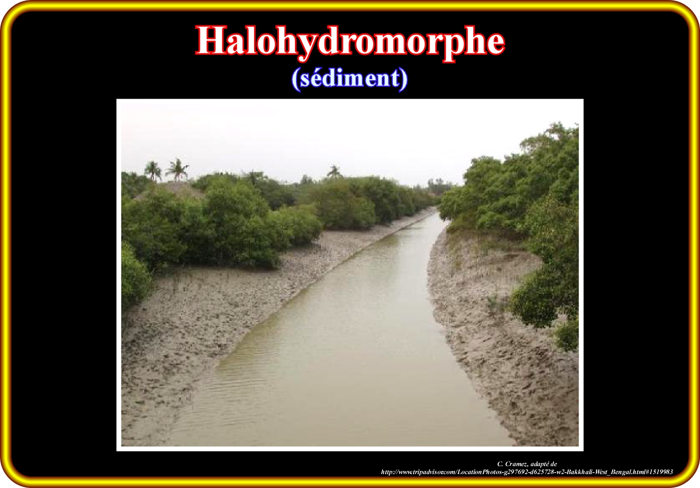 Dans le domaine littoral inter - tropical, la mangrove et les sédiments halo-hydromorphes associés illustrés dans cette figure (Bakkhali, West Bengal) occupent la zone directement soumise à l’ influence des marées et ainsi elle correspond aux étages supra - littoral, moyen - littoral et à la partie supérieure de l’étage infra - littoral en accord avec le système de donation classiquement utilisé dans l’environnement marin. C’est cette zone, avec une teneur en sel plus au moins variable et qui, normalement, est colonisée par des mangroves, forme la formation végétale amphibie que Macnae (1968) a appelée "Mangrove", une fois qu’elle forme, généralement, un écosystème spécifique. Les mangroves sont des écosystèmes qui comportent des communautés végétales et animales typiques des milieux inondés, résistants à une forte salinité de l’eau et du sol qui colonisent les côtes tropicales et sub - tropicales des Amériques, Afrique, Asie et Océanie. Les espèces végétales qui constituent la mangrove sont physiologique et morphologiquement adaptées au milieu amphibien euryhalin (avec une forte diversité des teneurs de sel) qui supportent des fortes pressions osmotiques (pressions qui doit s’exercer sur une solution pour empêcher le passage du solvant à travers une membrane semi - perméable) lesquelles qui sont appliquées au système ses des et régions racines et pneumatophores. Les racines neumatophore, qui sont aussi connues comme des racines respiratoires, se développent dans régions inondées, où le sol est, généralement, très pauvre en oxygène. Elles sont caractérisées par : (i) Partirent de racines existantes dans le sol ; (ii) Croître verticalement ; (iii) Émerger de l'eau et (iv) Avoir des pores qui permettent l'absorption de l'oxygène atmosphérique. Un animal extrêmement euryhalin peut être en mesure de tolérer des périodes plus ou moins longue dans l'eau douce. Le terme euryhalin est, également, utilisé pour les animaux d'eau douce qui peuvent résister à des augmentations considérables de la teneur en sel de l'eau sans que leur métabolisme soit affecté. Un organisme, sténohalin marin ou d'eau fraîche, peut résister uniquement à une petite variation de la concentration en sel de l'eau où il habite. Ces animaux utilisent des systèmes de contrôle de la salinité, comme par exemple, des glandes lacrymales, fosses nasales, etc.