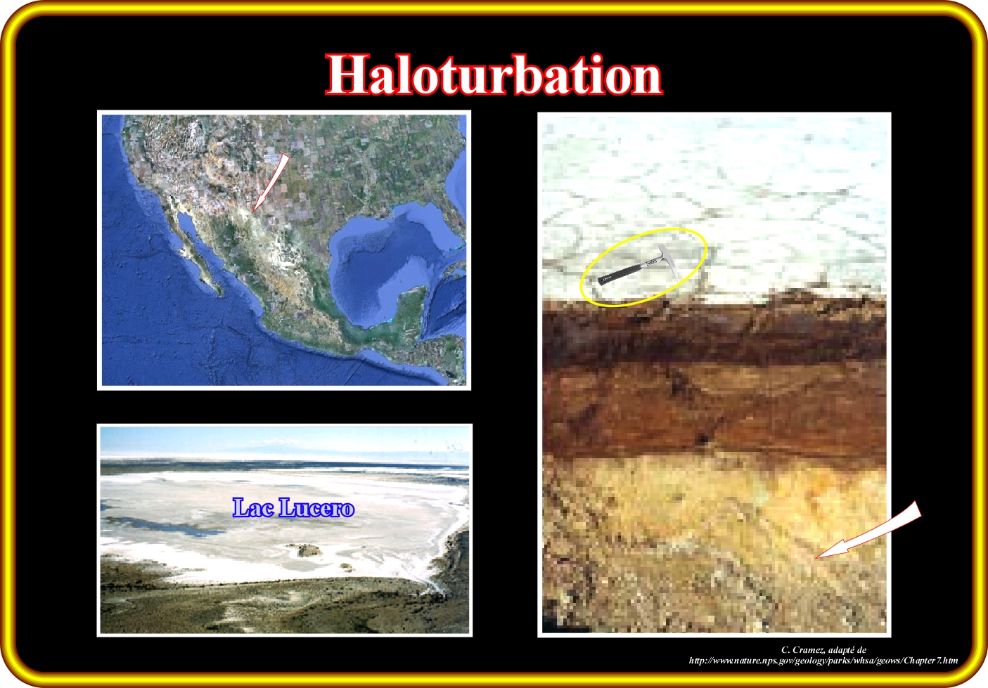 Le processus de haloturbation est une déformation importante impliquant, le plus souvent, du gypse ou de l’halite. Dans les plaines de vase salifère des fissures superficielles sont très fréquents qui, parfois, forment des polygones très caractéristiques. De même des croûtes carbonatées ou d'autres minéraux sont également fréquents. Surfaces en flocons, avec une précipitation de gypse, sont également fréquents. Dans cette photo, les boues sablo - détritiques proviennent de la zone côtière par ruissellement superficiel et se sont déposés sur la surface de la playa à l'embouchure du ruisseau Andrecito dans le lac Lucero. Les fissures de dessiccation sur la surface de la playa sont évidentes. Un intervalle de sable brun boueux souligne un extrême haloturbation. Les sédiments sous-jacents sont des dépôts de gypse, autrement dit, la surface que limite les boue marron et le gypse blanc soulignent la différence entre les sédiments du Pléistocène et Holocène. Les interdigitations des évaporites et les lits de sable de la formation Grayburg (Texas) du bassin de Palo Duro montrent des magnifiques exemples de haloturbation (Nance, 1986). Ces dépôts se sont accumulés dans un bassin épicontinental de 28000 km^2 caractérisé par l'aridité régionale et épisodique, à proximité de l'afflux des eaux marines hypersalines. Dans chacun des différents cycles stratigraphiques de progradation récurrente se développe un certain nombre de différents environnements sédimentaires telles que des dunes éoliennes, les zones situées entre les dunes, des manteaux de sable, boue salifère un grand peu profond de la saumure marine (salines). Sources de silice - clastiques se trouvent à l’Ouest et Nord, tandis que les saumures proviennent du Sud et Sud - Ouest. Les dépôts des dunes éoliennes détritiques à grain fin présentent une stratification entrecroisée avec un angle moyen à fort (15 - 35°). Entre les dunes, se sont déposés des strates, plus ou moins, horizontales ou ondulées de sable fin avec de fines structures d’illuviation. Les manteaux de sable sont caractérisés par des dépôts horizontaux, bien calibrés, de grès très fin avec des structures illuviations. Les manteaux de sable et les plaines de sable et les plaines de boue sont formées par des sables et silts avec stratification granoclassée, ondulations et structures "flaser" déformées internement par haloturbation.