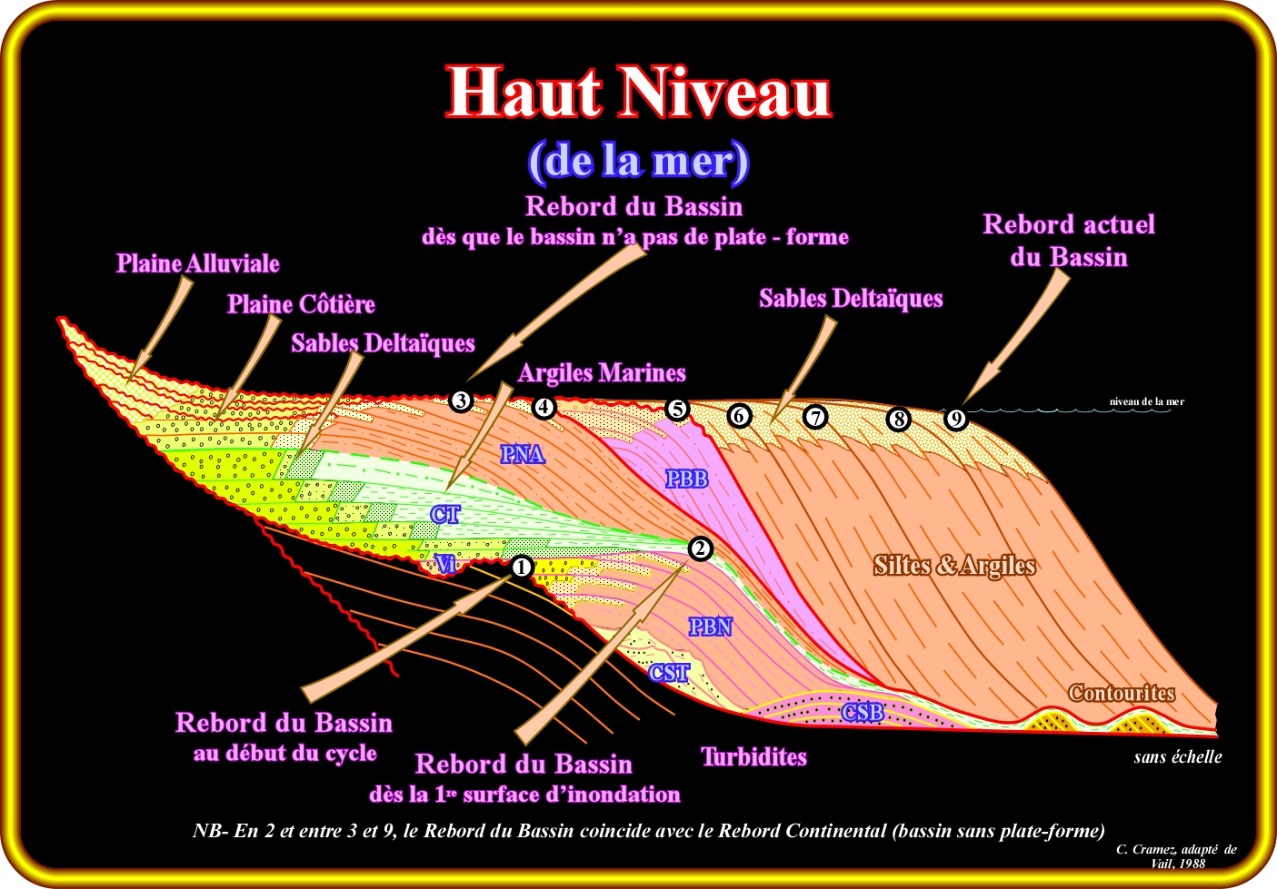 Un cycle stratigraphique dit cycle-séquence est induit par un cycle eustatique de 3ème ordre, autrement dit, un cycle eustatique limité entre les deux chutes relatives du niveau de la mer consécutives, dont la différence d’âge (duré du cycle) est comprise entre 0,5 et 3 à 5 My. La morphologie de surface d’érosion associée à la discordance inférieure qui est la limite basale du cycle-séquence, est contrôlée par le dernier rebord du bassin du cycle stratigraphique sous-jacent (dernier rebord su PHN du cycle antérieur). Au début du nouveau cycle-séquence, le niveau de la mer est plus bas que le rebord du bassin et ainsi, les caractéristiques géologiques du bassin sont dites de bas niveau. C'est au cours de ces conditions géologiques que se dépose le cortège de bas niveau (CBN), lequel comprend trois membres : i) Cônes sous-marins du bassin (CSB); (ii) Cônes sous-marins du talus (CST) et (iii) Prisme de bas niveau (PBN). Cela signifie que pendant le dépôt de ces membres, le rebord du bassin est toujours, plus ou moins, le dernier rebord du cycle-séquence précédent (lorsque le cycle sous-jacent est complet, c’est-à-dire, constitué par tous les cortèges sédimentaires, ce qui n'est pas toujours le cas.) Dans cette tentative d'interprétation géologique d’une sismique en ligne de l’offshore du Labrador (Canada), les dépôts du cortège de bas niveau (CBN), ainsi que rebord du bassin au cours de cette période (dernier rebord du bassin du cycle sous-jacent), ne sont pas visibles (localisés à l’Est de la ligne sismique). Cependant, dès la première inondation de la plaine côtière du prisme de bas niveau (haut niveau précoce), les conditions géologiques changent vers des conditions de haut niveau, puisque le nouveau rebord du bassin est, maintenant, déterminé par la dernière rupture continentale du prisme de bas niveau. Au cours de la période de haut niveau précoce, qui se caractérise par une montée relative du niveau de la mer en accélération, se dépose le cortège transgressif qui, comme illustré dans la tentative, est caractérisé par une géométrie globalement rétrogradante (déplacement vers le continent de la rupture côtière).