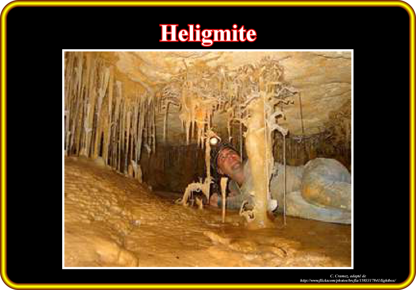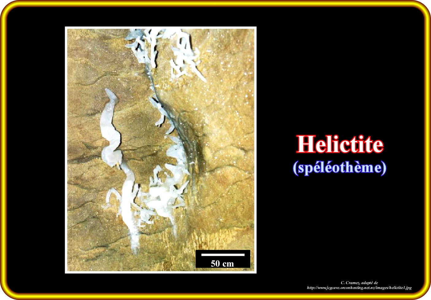 Spéléothème qui se trouve dans cavernes des roches carbonatées et qui change son axe vertical dans un ou plusieurs stades de sa croissance. Les helictites ont une forme courbe ou un angulaire, comme si elles auraient poussé en dehors du champ de gravité.