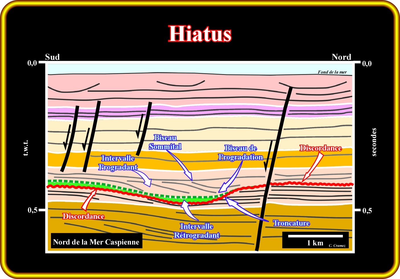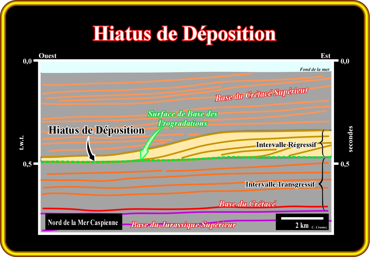 Dans cette tentative d'interprétation géologique d'une ligne sismique du nord de la mer du Caspienne, il est facile d'identifier un intervalle sismique progradant, avec une configuration complexe du type sigmoïde-oblique, qui fossilisent un intervalle transgressif dont la configuration interne semble parallèle, mais en réalité, elle est rétrogradante. La limite entre ces intervalles sismiques correspond à une surface de base des progradations principales qui souligne un hiatus de non-dépôt. En fait, au maximum de l'épisode transgressif maximale, la ligne de côte était, probablement, à plusieurs dizaines, voir même des centaines de kilomètres à l'Est de la région interprétée. La plate-forme continentale était très grande et les conditions géologiques étaient de bassin affamé (avec un taux de sédimentation très faible), sauf dans le plus proximal de la plate-forme, c’est-à-dire, proche du continent. Dès que le niveau eustatique (globale) a commencé à descendre, puisque le volume des bassins océaniques ont commencé à augmenter, en raison de l'activité des zones de subduction de type B (Benioff) et dû aux collisions entre les plaques lithosphériques (zones de subduction de type A ou Ampferer), la ligne de côte a commencé à se déplacer lentement vers la mer au fur et à mesure que les sédiments progradants se déposaient. Comme illustré dans cette tentative, des biseaux de progradation ont fossilisé, peu à peu, l'hiatus de non-dépôt entre les deux intervalles. Bien sûr, que cet hiatus augmente avec la distance à la ligne de côte. Cela signifie que la différence d'âge entre les sédiments régressifs et transgressifs traversés dans un puits d’exploration, situé loin de la ligne de côte, autrement dit l’hiatus, est beaucoup plus grande que la différence d'âge des mêmes sédiments lorsque le puits est situé plus en amont. Il est important de noter que l’âge de la plupart des événements géologiques, comme par exemple l'âge d'une discordance (surface d’érosion induite par une chute relative du niveau de la mer) est, généralement, donnée par l'hiatus minimum. Ainsi, l’âge la plus probable d’une discordance est celle des cônes sous-marins de bassin associés.