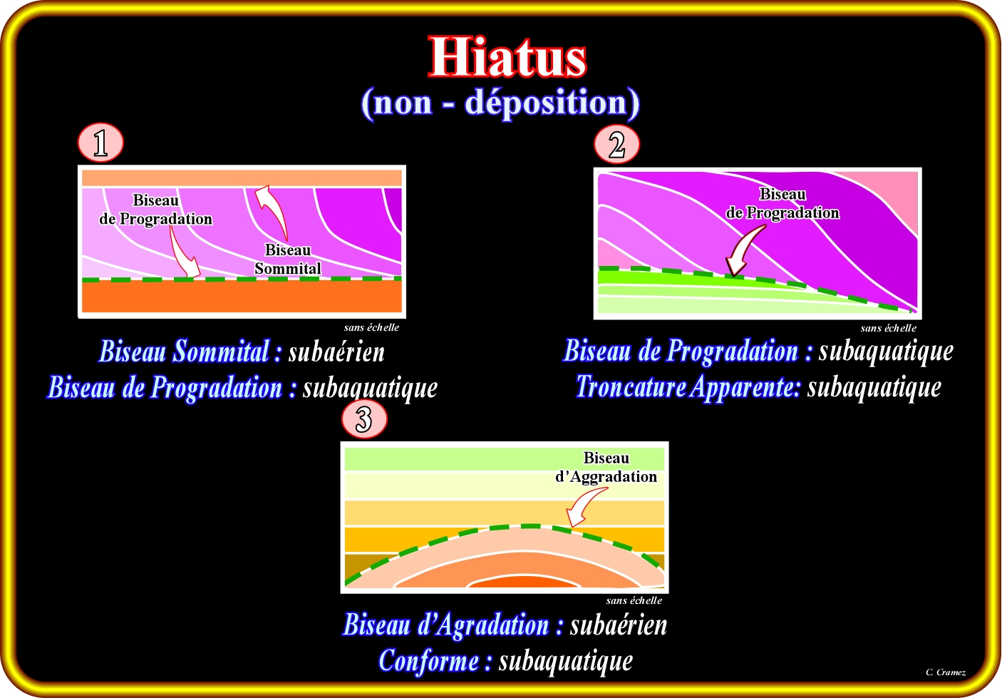Ces schémas illustrent les différents cas d’un hiatus de non-dépôt dans des environnements sédimentaires différents. La détermination des relations géométriques entre les strates (ou réflecteurs sismique) et les configurations internes des intervalles séparées par l’hiatus sont très importantes, car elles peuvent définir des surfaces de base des progradations ou biseaux aggradation qui, évidement, traduisent des histoires géologiques différentes. Dans le premier schéma (1), les successifs biseaux de progradation soulignent une surface de base des progradations d’un intervalle qui fossilise un hiatus de non-dépôt qui augmente vers l'aval. Les terminaisons supérieures des réflecteurs de ce même intervalle régressif (ou progradant) définissent une surface de biseaux sommitaux qui peut avoir été produite par une discordance, c'est-à-dire, par une chute relative du niveau de la mer (surface d'érosion) ou par un la zone de transfert (zone à travers laquelle les sédiments sont transportés sans être déposés). Dans le premier cas, l'hiatus est d’érosion, mais le seconde cas, il est de non-dépôt. Dans le second schéma (2), les terminaisons supérieures de l'intervalle progradant (ou régressif) ne sont pas visibles, par conséquent, uniquement l'hiatus inférieur associé à la surface de base des progradations est significatif. Évidement, l'hiatus est de non-dépôt, puisque l'intervalle est progradant. C'est pour cela que dans la stratigraphie séquentielle les surfaces de base des progradations ne sont pas des limites des cycles stratigraphiques, car elles ne sont pas induites par une chute relative du niveau de la mer, c'est-à-dire qu'elles ne sont pas des surfaces d'érosion. Le troisième schéma (3) représente un cas particulier dans lequel le soulèvement des sédiments n'a pas été pas suffisant, au moins localement, pour les placer dans un environnement subaérien, autrement dit, qu'ils n'ont, pratiquement, pas été érodés. Ainsi, les biseaux d’aggradation du cycle stratigraphique sus-jacent fossilisent un hiatus de non-dépôt et non un hiatus d’érosion.