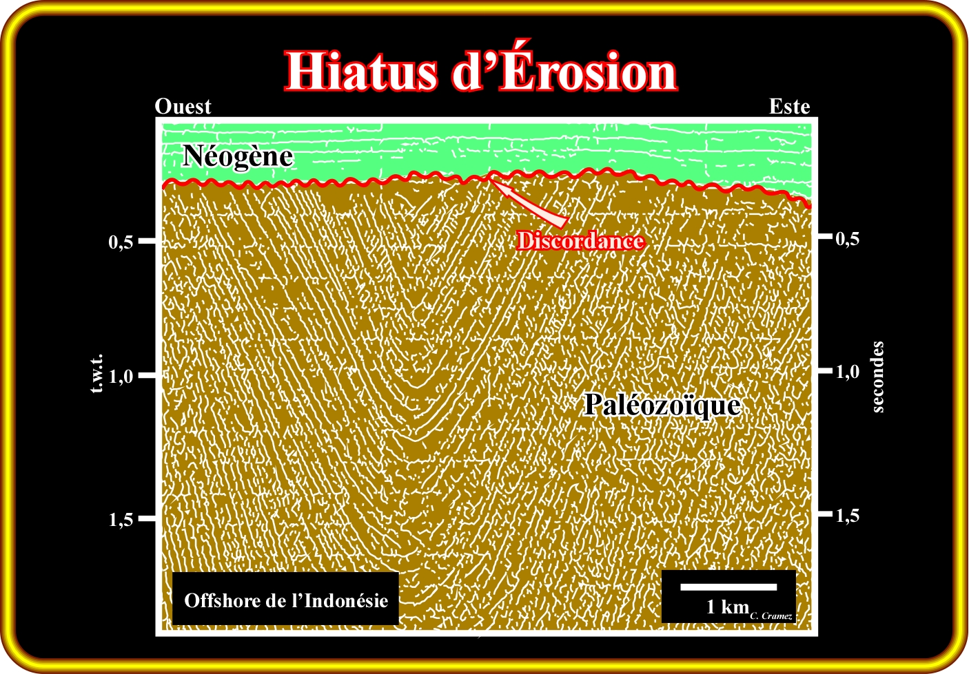 Dans cette tentative d'interprétation géologique d’une sismique de l’offshore de l'Indonésie, la discordance entre les sédiments du Paléozoïque et du Néogène est évidente. Cette discordance qui localement, est renforcée par la tectonique (discordance angulaire), a créée un hiatus très grand. En effet, on peut dire que dans la région où la ligne a été tirée, l'hiatus (au moins dans cette région) est d'environ 210 My, c'est-à-dire le temps géologique des strates qui ont été enlevées par l'érosion. Cependant, il est probable qu'une partie de cet hiatus corresponde à un hiatus de non-dépôt. Dans cette tentative, il ne faut pas oublier : (i) Une discordance (renforcée ou non par la tectonique) souligne toujours une surface d’érosion ; (ii) Une surface d’érosion est induite par une chute relative du niveau de mer, c'est-à-dire, qu’elle met le niveau de la mer plus bas que le rebord du bassin (ne pas confondre le rebord du bassin avec le rebord continental, une fois qu’en conditions géologiques de haut niveau ils ne coïncident pas) ; (iii) La chute relative du niveau de la mer est induite par l'eustasie et par la tectonique (subsidence ou soulèvement) ; (iv) L’eustasie est prépondérante ; (iv) La cyclicité de l’eustasie est plus rapide que celle de la tectonique ; (v) Dans un cycle tectonique il y a plusieurs cycles eustatiques, c’est-à-dire, plusieurs chutes relatives du niveau de la mer, par conséquent, plusieurs discordances ; (vi) Une discordance est toujours une limite entre deux cycles stratigraphiques ; (vii) L’hiatus d'érosion est donnée par l'intervalle de temps géologique équivalent aux strates érodées ; (viii) L'âge de la discordance (l’âge de l'érosion) est donné par l'âge des turbidites induites par la chute relative du niveau de la mer qui l'a créée, à savoir, l'âge du plus petit hiatus de non-dépôt entre les sédiments sous et sus-jacents à la discordance.