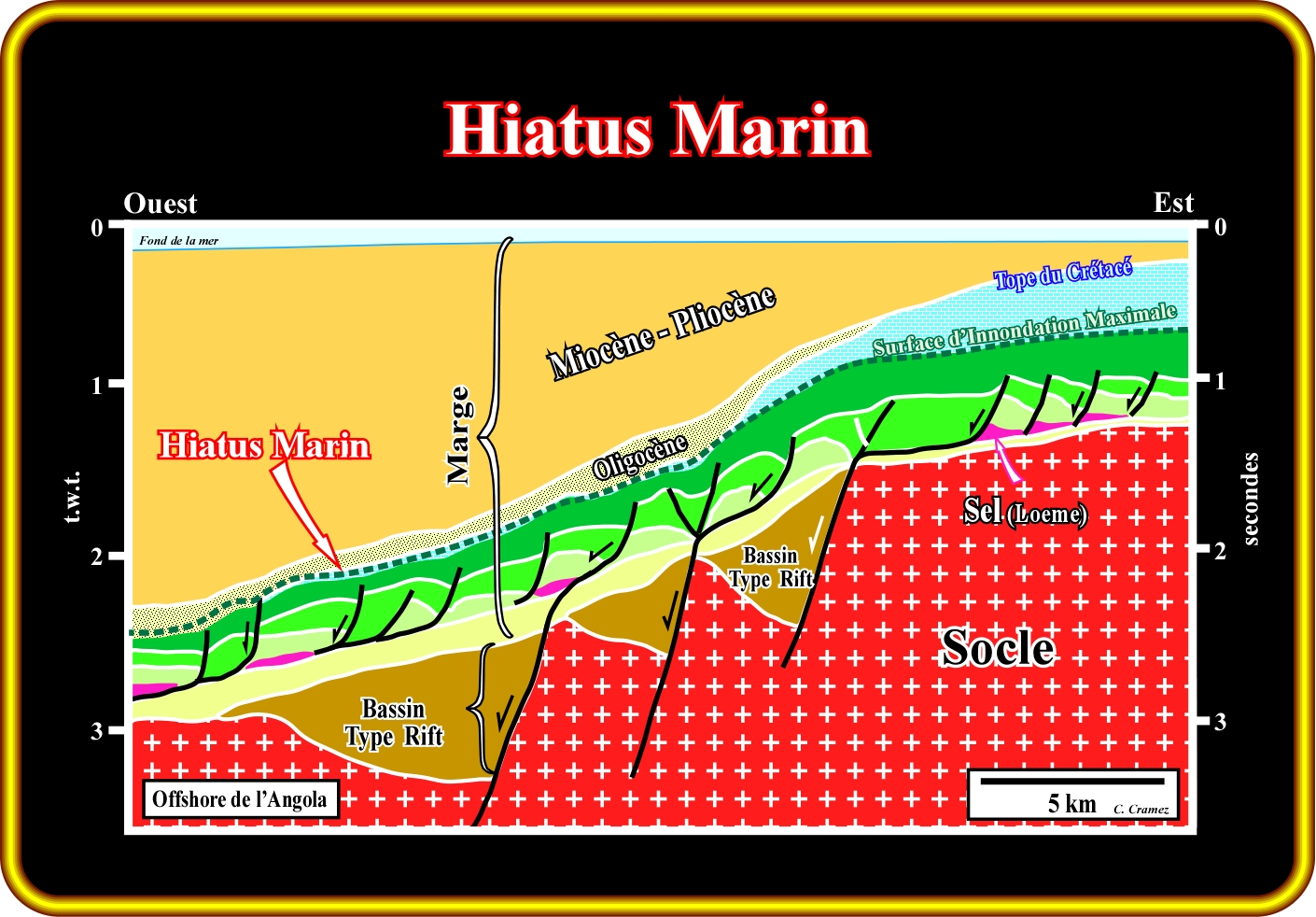 Cette tentative d'interprétation géologique d’une ligne sismique de l’offshore nord de l'Angola illustre l’hiatus entre la phase transgressive et régressive du cycle d’empiétement continental post-Pangée, lequel augmente vers le bassin. L'hiatus minimum le long de la surface de base progradations marque l'âge du maximum de la transgression du Crétacé (91,5 Ma, Cénomanien-Turonien). L'histoire géologique suggérée par cette tentative d'interprétation est probablement la suivante : (i) La croûte lithosphérique pré-Pangée a été allongée par un régime tectonique extensif formant des bassins de type-rift ou d'effondrement (hemi-grabens remplis par des sédiments non-marins) ; (ii) À partir d’un certain moment, la lithosphère ne peut plus s’allonger par des failles normales et se casse, individualisant deux grandes plaques lithosphérique (Afrique et Amérique du Sud), au fur et à mesure de l'expansion océanique (formation de croûte océanique nouvelle et du proto-océan Atlantique Sud) ; (iii) Sur les marges des nouveaux continents s’est déposé, au-dessus des bassins de type-rifte et du substratum rocheux de la Pangée, une marge continentale divergente en association avec un cycle de eustatique de première ordre, qui a été responsable du dépôt du cycle d’empiétement continental post-Pangée ; (iv) Ce cycle stratigraphique est formé par deux grandes phases tectonique-stratigraphiques, la phase transgressive et régressive ; (v) La phase inférieure est la transgressive qui a été induite par une montée eustatique causée par l'expansion océanique et en particulier par la formation des montagnes océaniques (dorsales médio-océaniques) qui ont réduit le volume des bassins océaniques (la quantité d'eau sous toutes ses formes est considérée comme constante depuis le début de la formation de la Terre) ; (vi) Au cours de la montée du niveau de la mer, la ligne de côte, ainsi que les centres de dépôt (dépocentres) côtiers se sont déplacés, peu à peu, vers le continent ; (vii) Dès que le niveau eustatique a commencé à descendre, la ligne de côte a initié son déplacement vers l'aval fossilisant, progressivement, la surface d'inondation maximale du Crétacé, qui souligne un énorme hiatus marin de non-dépôt.