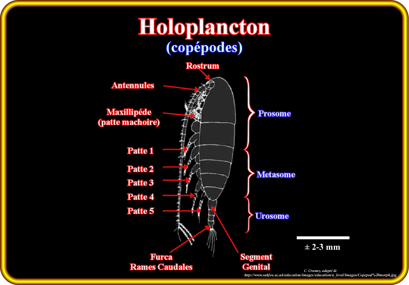 Le holoplancton est une partie du plancton animal ou zooplancton. On appelle holoplancton ou plancton vrai aux organismes qui restent dans l’état de plancton tout au long de leur cycle de vie. Il contraste avec le méroplancton ou plancton temporaire, qui est composé d'organismes qui passent uniquement une partie de leurs vies, habituellement, dans l’état larvaire, sous la forme de plancton (méduses, crustacés, larves, vers, etc.). Le holoplancton se compose, principalement, de micro-algues, animaux unicellulaires et quelques crustacés comme les copépodes, qui représentent environ 70 % du zooplancton. Les copépodes, comme illustré sur cette figure, sont des organismes planctoniques qui vivent en toute liberté (comme une petite cochenille, variété de pucerons), qui ont entre 1 et 10 mm de longueur. Ils sont capables de se déplacer librement sous de courtes distances, tremblant les membres articulés et antennes. Ceci est interprété comme un mécanisme pour éviter les prédateurs. Leurs antennes contribuent également à les empêcher de couler à travers la colonne d'eau. Il y a des milliers d'espèces de copépodes formant le holoplancton. Certains vivent en eau douce, mais la plupart sont des organismes marins qui ont une morphologie basique. Les copépodes sont, probablement, les organismes multicellulaires les plus abondants sur la Terre. Certains scientistes pensent qu'il existe environ 11 500 espèces de copépodes divisés en environ 200 familles et 1650 genres. Les copépodes sont un groupe diversifié, et même si certains sont carnivores ou omnivores, la majorité sont des herbivores se nourrissant du phytoplancton. Ils s’alimentent grâce à un système de filtration ou en utilisant les appendices pour manipuler la cellule. L'émergence de populations de copépodes durant toute l'année affecte les cycles de phytoplancton dans l'océan. Dans l’holoplancton on trouve également des cnidaires (animaux aquatiques coelentérés tels que les hydres d'eau douce, méduses, coraux, anémones de mer et caravelles), chétognathes (petits animaux marins avec environ 15 cm de long et corps allongé, non segmenté, et avec des ailettes latérales et caudales qui sont des extensions de l'ectoderme), ostracodes (petits crustacés pourvus d'une coquille calcaire constituée par deux coquilles qui s’articulent par intermédiaire d'une structure appelée charnière, située dans la région dorsale), etc.