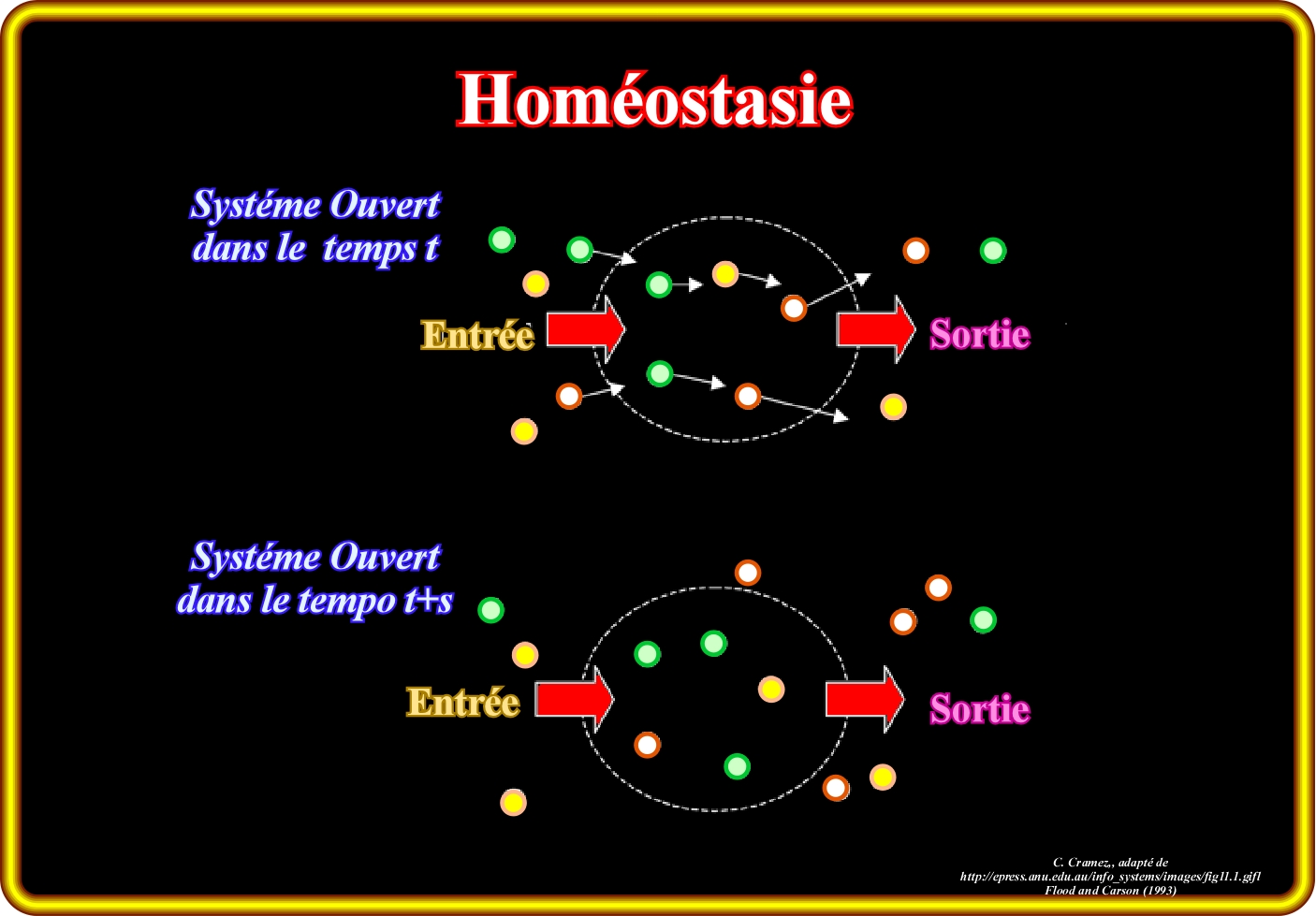 L'homéostasie est l'une des propriétés les plus importantes de tout organisme vivant. Cependant, ce terme s'applique également aux organisations humaines ou de travail quand traitées comme des systèmes ouverts. Une organisation a besoin de recruter des nouveaux employés pour remplacer ceux qui prennent leur retraite, mais aussi de matières premières, énergie et informations pour les utiliser de leurs processus et opérations afin de se maintenir dans un état stable. Une organisation qui peut sembler de l’extérieur statique et immuable est, à l'intérieur, dans un état de flux de l'équilibre dynamique. Un autre aspect important d'un système ouvert dans un état d'équilibre dynamique, c'est qu'il dépend de mécanismes de rétroaction pour rester dans cet état. Dans la hiérarchie de Boulding qui classe les systèmes en fonction de leur complexité, il n'est pas surprenant de constater que les propriétés exhibées par les systèmes inférieurs de la hiérarchie se trouvent également dans les niveaux supérieurs, parce que ceux-ci sont construits sur les premiers. Un système qui est classé comme un système ouvert, possède toutes les qualités qui appartiennent au système au niveau cybernétique (auto-régulation). Le comportement des systèmes ouverts est largement déterminé par les mécanismes de rétroaction qu’ils possèdent. Il y a deux types de rétroaction qui opèrent dans la plupart des systèmes : rétroaction négative et positive. La première réduit ou élimine l'écart du système à partir d'une norme particulière. Ainsi, un mécanisme de rétroaction négative tend à neutraliser l'effet de perturbation de l'environnement de telle sorte que le système peut maintenir sa direction normale de fonctionnement. En outre, elle amplifie la rétroaction positive ou augmente le changement, ce qui conduit à une divergence en continu de l'état initial. La rétroaction positive coopère avec la rétroaction négative dans les systèmes vivants (organismes et organisations ont, aussi, les deux types de rétroaction lors de la croissance, bien que le résultat soit positif). Toutefois, l'opération de rétroaction positive, uniquement par elle, peut, éventuellement, aboutir à la désintégration du système. Une rétroaction négative a un rôle clé dans la capacité du système pour atteindre un état stationnaire ou homéostasie.
