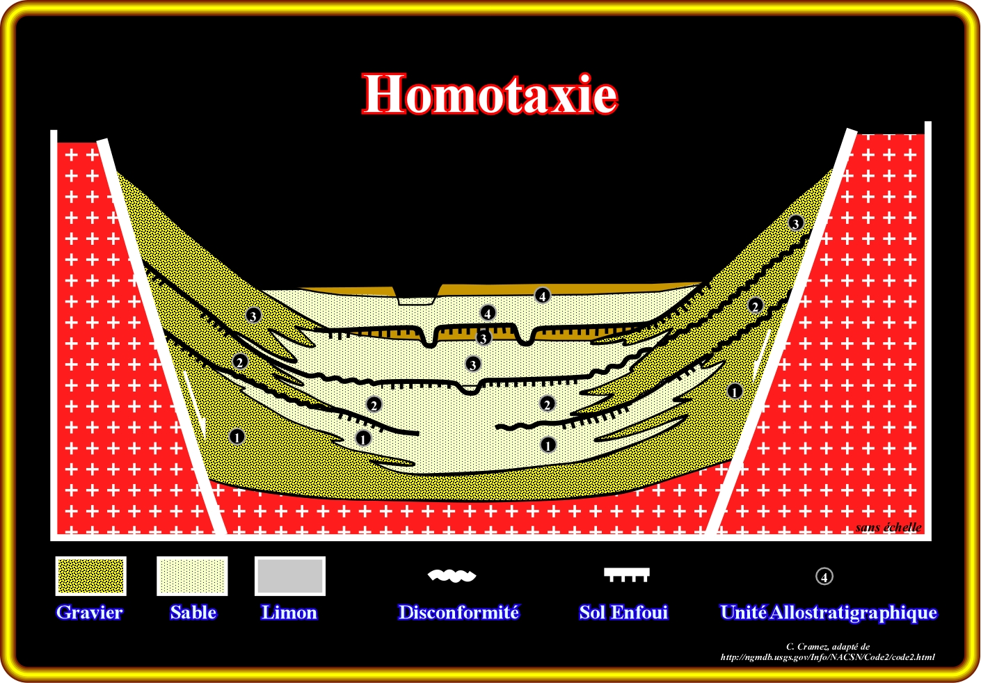 Démontrer qu’une succession de faune, flore ou taxa (pluriel de taxon) peut se confirmer d’une coupe géologique à une autre, d'un bassin sédimentaire à un autre ou d'un continent à un autre, c’est ce qui habituellement on appel homotaxie. Toutefois, une telle démonstration ne montre d’aucune façon, que ces successions sont synchrones. Ceci est le grand problème des fossiles guides et la principale question est de savoir comment on passe d’événements géologiques ordonnés à des événements géologiques datés. Ce problème, souligne la grande impasse de la biostratigraphie, autrement dit, les données paléo-biologiques et stratigraphiques caractéristiques d'un événement géologique particulier ne permettent pas d’établir son synchronisme. Sur ce sujet on ne peut pas oublier : (i) Les fossiles soulignent une succession irréversible d'événements et (ii) Les corrélations biostratigraphiques dépendent l'émergence évolutive d'une espèce, à partir de son ancêtre, de la survie et de l'expansion géographique. En outre, le principe des corrélations suppose que les communautés biologiques, en des endroits différents, sont synchronisées ou que les signaux biologiques sont transmis instantanément ou les deux, ce qui n'est pas nécessairement vrai. Le schéma illustré dans cette figure est un bon exemple d'une interprétation allostratigraphique (unités cartographiables définies et identifiées sur la base des discontinuités qui les limitent) de dépôts alluviaux et lacustres d'un bassin de type-rift (hémi-grabens et grabens), que le bassin soit du Crétacé ou du Néogène, ce qui signifie que le homotaxie n’implique pas nécessairement une synchronisation des dépôts. Les dépôts alluviaux et lacustres peuvent être inclus dans une seule formation géologique ou être séparés, latéralement, dans des formations distinctes sur la base des relations géométriques ou sur la base de leurs fossiles.