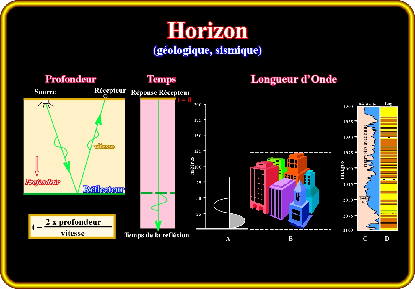 Ces schémas illustrent, en profondeur et temps, l'un des mécanismes fondamentaux de la sismique de réflexion qui ne doit pas être oublié par les géoscientistes qui interprètent les lignes sismiques en termes géologiques. À gauche, on peut voir la source, la profondeur d’un réflecteur (interface entre deux intervalles sédimentaires), le récepteur et le temps de réponse. La réponse en profondeur est donnée par la profondeur temps du réflecteur multipliée par la vitesse des ondes sismiques dans l’intervalle sédimentaire sus-jacent au réflecteur. À droite, est représentée une comparaison entre : (A) Un cycle d'une onde sismique de 30 Hz, dans un milieu de vitesse moyenne 1832 m / s (60 Hz à 3500 m / s) ; (B) Bâtiments et (C) La colonne stratigraphique traversée par un puits d’exploration d’un champ pétrolier. Comme on peut le constater, dans un cycle d'une onde sismique normale est, presque toujours, inférieur à un bâtiment de 50 m de haut. Ainsi, les géoscientistes qui interprètent les lignes sismiques, doivent être prudents lorsqu'ils proposent, dans leurs tentatives, des corps géologiques de petite taille tels que des barres de méandre, remplissages de chenaux, etc. Ils doivent tenir en ligne de compte les échelles et résolution sismique (verticale et latérale). La résolution verticale correspond à la distance verticale minimale entre deux interfaces qui est requise pour qu’une simple réflexion puisse être observée. Cette distance est contrôlée par la longueur d'onde du signal sismique (± 50 m). La résolution latérale est déterminée par le rayon de la zone de Fresnel (région dans le réflecteur où l’énergie est réfléchie de manière constructive) qui dépend de la longueur d'onde de l'impulsion acoustique et de la profondeur du réflecteur. Dans une ligne sismique non-migrée, la résolution latérale est déterminée par trois facteurs : (i) Largeur de la bande sismique ; (ii) Vitesse d’intervalle et (iii) Temps de trajet jusqu’au réflecteur.