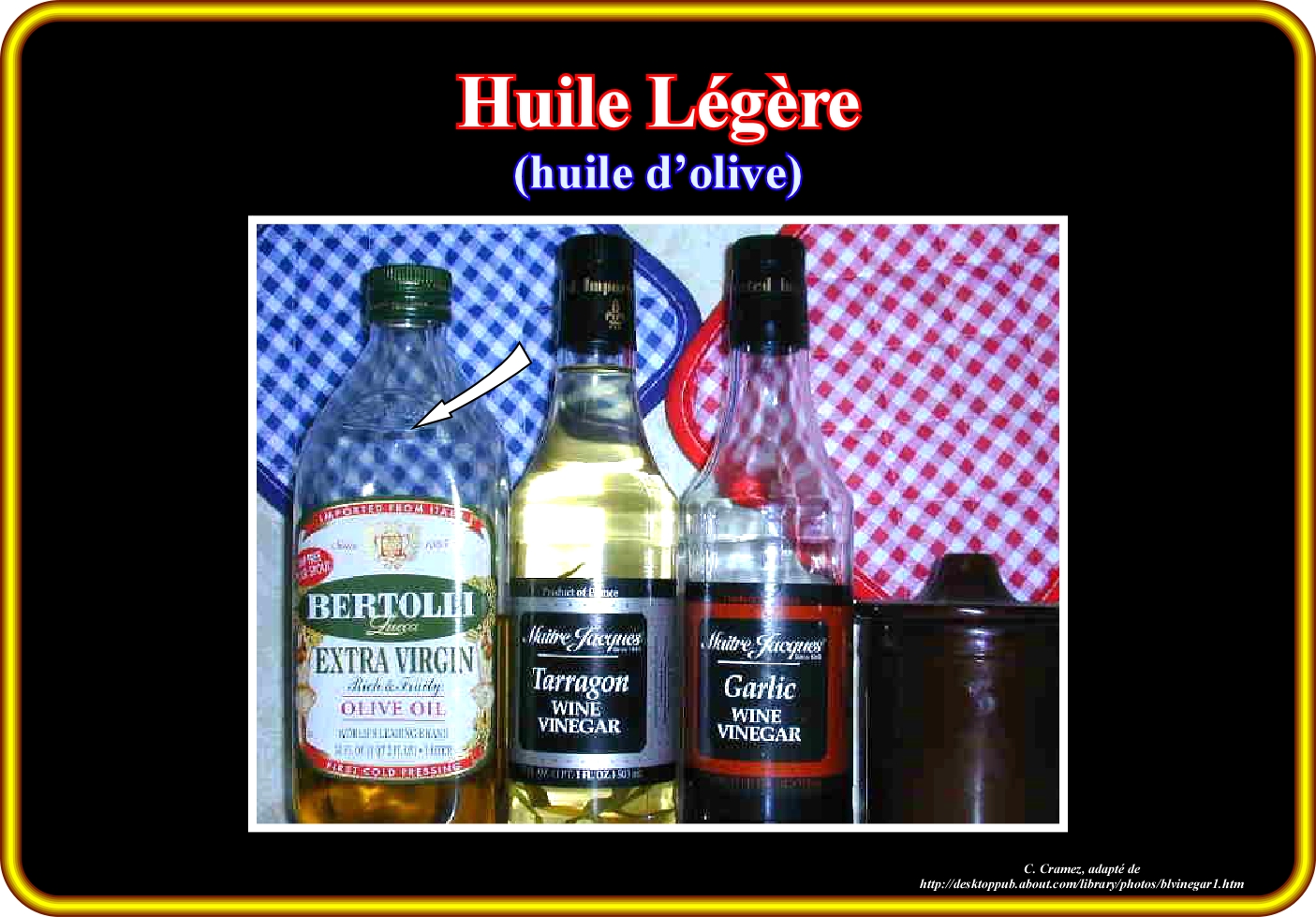 Un des huiles légère la plus courante est l'huile d'olive qui, lorsqu’il est de bonne qualité, a une faible viscosité et densité. Le Portugal, par exemple, a produit, en 2005, environ 1 % de la production mondiale. En moyenne, chaque portugais consomme 7 kg par an, ce qui représente environ 2 % de la consommation dans le monde. L'huile d’olive est produite par broyage des olives et extraction de leur huile par un moyen mécanique ou chimique. Les olives sont broyées à l'aide de grandes meules ou des fûts en acier. Les olives non mûres produisent de l'huile amère et les très mûres produisent de l'huile rance, ce qui signifie que pour obtenir une bonne huile est nécessaire d'utiliser des olives parfaitement mûres. Comme illustré, pour savoir ce qu’on achète on doit comprendre la signification des étiquettes. Dans un supermarché, on peut trouver des à différents labels : (i) "Extra Vierge" qui signifie tout simplement vierge ; (ii) “100 % Pure Huile d'Olive” signifie qui est l’huile de plus faible qualité disponible (les meilleurs doivent avoir « vierge » sur l'étiquette) ; (iii) "à base d'huile d'olive raffinée" signifie que le goût et l'acidité ont été chimiquement contrôlés ; (iv) « Huile d'olive légère », qui désigne l'huile d'olive avec moins de saveur (tout l’huile a 120 kcal / par cuillère à soupe, soit environ 34 kJ / ml) ; (v) “ Huile d'olive faite à partir d’olives prises à la main » ce qui signifie que l'huile est de meilleure qualité, une fois que les producteurs qui récoltent des olives par des procédés mécaniciens ont tendance à laisser trop mûrir les olives pour augmenter leur rendement ; (vi) « Huile de première expression à la température ordinaire” qui est un pur verbiage commercial sans aucun sens (suggère que l'huile dans des bouteilles avec cette étiquette est une huile qui vient de premier broyage et qui la chaleur qui n'a pas été utilisé, ce qui est inexact, car il n'y a pas broyage sans production de chaleur) et ne définit aucune température précise. Toutefois, selon la réglementation européenne, la température au cours du broyage, doit toujours être inférieure à 27° C.