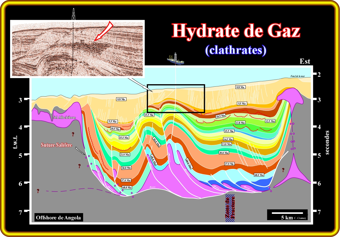 Dans cette tentative d'interprétation géologique d’une ligne sismique régionale de l’offshore profond du nord de l'Angola, le groupe de réflexions sismiques diachroniques, c'est-à-dire, qui coupent les réflecteurs chronostratigraphiques (détails de la ligne sismique en haut et à de la gauche de la figure), souligne la limite supérieure de la zone avec des hydrates de gaz ou gaz clathrates. Ce réflecteur RSFM (Réflecteur Simulant le Fond Marin) est mimétique du réflecteur associé avec le fond de la mer. Il ne peut pas être un multiple du fond de la mer, une fois que la profondeur de l'eau est beaucoup plus grande que la distance entre le fond et réflecteur. Le réflecteur diachronique correspond, probablement, à un RSFM induit par les boules de gaz naturel (méthane) dans la base de la zone de stabilité du gaz clathrates, laquelle ne peut pas être considérée comme une zone étanche (zone de couverture), vu que la porosité est remplie à plus de 95 % d'eau. Malgré le fait que certains géoscientistes affirment que les ressources potentielles associées aux hydrates soient, en certaines offshores, supérieures à 100 000 Tcf, à l'heure actuelle, personne sait récupérer du gaz à partir d'hydrates, lesquels disparaissent dès que l’outil de forage pénètre la zone à clathrates. En outre, plusieurs plates-formes de forage ont coulé lorsque les puits d’exploration ont entrée dans la zone à hydrates, avant les dispositifs de prévention aient été installés. Le gaz libéré arrive en surface rapidement et crée un fluide de faible densité qui force la plate-forme de perforation à partir vers le fond de la mer en vertu du principe d'Archimède.