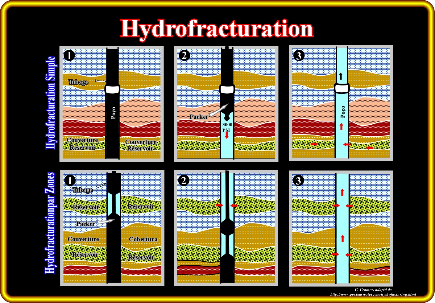 L’hydrofracturation est une méthode de développement et réhabilitation d'un puits de production, généralement, d'huile par de l'eau. L’hydrofracturation est utilisée pour augmenter le rendement des puits de à faible production (soit de l'eau soit d'huile) dans des formations géologiques où les systèmes de fractures sont très mal développés ou fermés. Aux États-Unis, l’hydrofracturation est utilisée depuis les années 80, pour augmenter la production des puits d'eau. Initialement, l’hydrofracturation a été utilisée dans des puits peu profonds (75 - 180 mètres) forés dans le socle (granite, gabbro, etc.) et dans les roches sédimentaires comme le calcaire et grès. La plupart du temps la fracturation est été faite entre 1000 et 2500 psi (livres par pouce carré) pour les roches du socle et s entre 300 et 800 psi dans la série sédimentaire, ce qui produit un écoulement de l'eau vers la surface entre 250 et 450 litres par minute. Pratiquement, dans la première phase d'une hydrofracturation, on descend dans le puits une garniture d’étanchéité (" £ä §<" en anglais) afin d’isoler la zone de la roche réservoir à être réhabilité. Puis de l'eau à haute pression est pompée à travers un tube d'injection vers la zone de la roche réservoir. La pression et l’écoulement forcé vers la roche réservoir créent dans la zone de production, l’ouverture de fractures radiales. Les fractures ainsi ouvertes ou de néoformation créer des connections avec les anciennes fractures, contenant de l'eau et avec les parois du puits. Dans un puits productif d'un gisement de pétrole (puits foré, principalement, pour produire du pétrole ou gaz, une fois que la structure et caractéristiques de production sont établies), le principe est le même : (i) L'équipement d’hydrofracturation injecte d'eau sous haute dans le réservoir ; (ii) La pression de l'eau ouvre les fractures du réservoir, ce qui permet au saturant (pétrole ou gaz) de s'écouler vers le puits. Dans une hydrofracturation par zones, on commence par isoler chaque zone avec des garnitures d’étanchéité et on injecte de l’eau sous pression pour augmenter la perméabilité de la formation. Cette opération est effectuée pour toutes les zones ayant un potentiel réservoir, ce qui permet l’écoulement du saturant vers le puits, qui, ensuite, est récupéré en surface, soit naturellement soit par pompage.