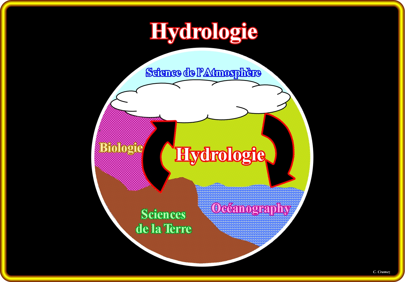 Science du cycle hydrologique, c'est-à-dire, du mouvement cyclique de l'eau des océans vers l'atmosphère, de l'atmosphère vers la surface de la Terre, de la surface de la Terre vers les courants d’écoulement et eaux souterraines et à nouveau, vers les océans. En d'autres termes, l'hydrologie est l'étude du mouvement, distribution et caractéristiques de l'eau au-dessus et en dessous des continents.