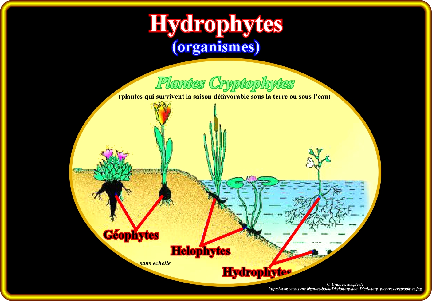 Comme illustré dans cette figure les plantes criptiques, c’est-à-dire, les plantes, qui vivent la saison défavorable sous la terre ou dans l'eau peuvent être : (i) Géophytes, qui ont des organes souterrains succulentes tels que rhizomes, bulbes et tubercules, et que pendant la période de les pluies peuvent développer, rapidement, une partie aérienne utilisant les hydrates de carbone stockés pour fleurir et fructifier dans un court laps de temps ; (ii) Helophytes, qui sont les plantes qui poussent dans des habitats marécageux ou le long des ruisseaux et rivières ; (iii) Hydrophiles (également connues sous le nom macrophytes aquatiques), qui vivent avec un secteur de leurs parties végétatives immergé en permanence dans l'eau (le terme hydrophyte désigne à la fois les algues et les plantes vasculaires). Les hydrophytes ont une série d'adaptations à leur environnement. Pour certains arbres, les racines peuvent être équipées de poches d'air, qui captent l'oxygène atmosphérique pour leur respiration. Les plantes herbacées et les rhizomateuses peuvent se présenter de trois façons : (a) Flottantes (quand ses racines ne sont pas attachés au fond et tout le corps de la plante reste flottant à la surface) ; (b) Semi-immergées (quand une partie de la plante reste en dehors du de l'eau, mais, au moins, les racines sont fixées au fond) et (c) Immergées (quand les racines sont fixées au fond et le corps de la plante reste sous l'eau). Chacun de ces types a une gamme de caractéristiques propres pour assurer leur subsistance. Les plantes flottantes sont normalement équipés d'aérenchyme (tissu composé de cellules gonflées ou des grands espaces intercellulaires, qui forment de grandes cavités à l'intérieur de la plante remplie d'air), ce qui rend leur poids plus léger ; elles ont, également, des racines courtes et simples, et un grand index de transpiration. Les semi-immergées ont, en général, des tiges courtes ou de rhizomes souterrains attachés au substratum et des feuilles ou pétioles longs, qui les maintiennent de hors de l'eau. Ces feuilles ont des stomates sur la face supérieure, et non sur la face inférieure, ce qui est plus habituel. Les plantes submergées on des tissus très mince et délicats, généralement, avec de petites feuilles en forme de bande sans tissu de soutien. Les fleurs restent parfois submergée, même si ce n'est pas une règle.