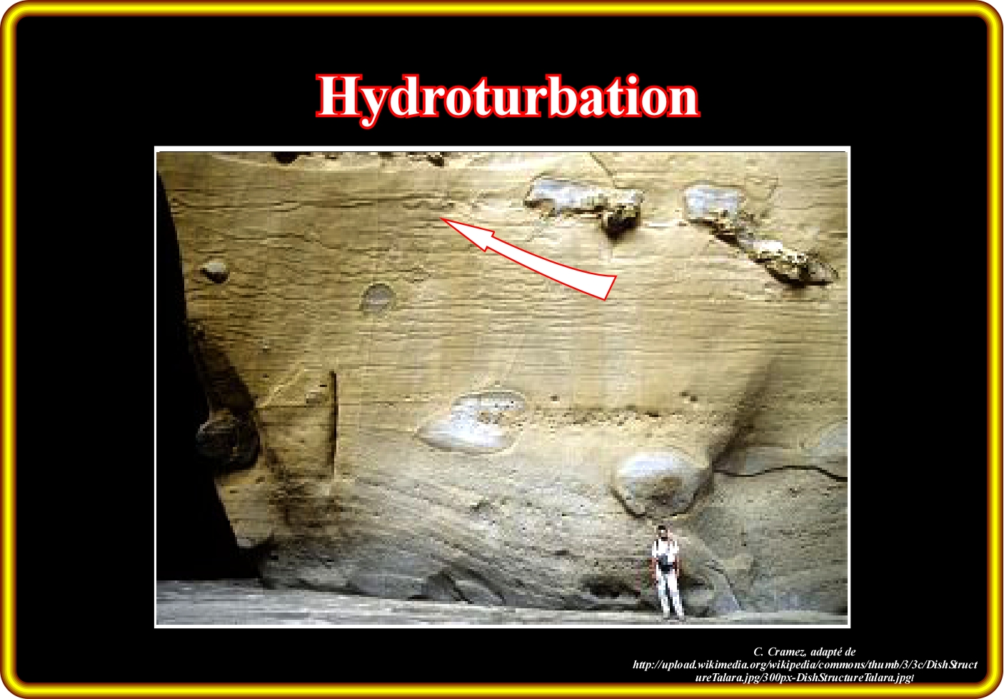 L’hydroturbation désigne, principalement, une déformation du sol sous l'action de l'hydratation et déshydratation, ainsi, par exemple, les fentes de dessiccation sont résultat de l’hydroturbation. En fait, lorsque la teneur en eau augmente, la pression provoque l’hydroturbation ou la peloturbation, comme certains géoscientistes disent, ce qui est dû au processus d'expansion et contraction de s minéraux argileux. Les colonnes de sol se développent là où les minéraux argileux sont lavés. Sur la surface une structure de micro gonflement se produit à côté des micro-cavités (microturbation). Il ne faut confondre hydroturbation et bioturbation. La bioturbation est le résultat du mélange de sol causée par les organismes. Ce mélange crée une expansion des horizons du sol, ainsi comme une lubrification des horizons de transition. La bioturbation produit une porosité secondaire, qui joue un rôle crucial dans la conductivité de l'eau en particulier dans les sols fins. Les processus de bioturbation promouvoivent la formation d'humus complexes qui stabilisent et augmentent la fertilité des sols. Évidement que la culture des sols d'origine anthropique partie de bioturbation, bien que, classiquement, elle n'est pas pris en compte par les géoscientistes. Également, on ne doit pas confondre hydroturbation et cryoturbation, qui est une turbation, c'est-à-dire, un ensemble de processus de mélange des sédiments ou des horizons d'un sol causé par le gel et dans laquelle les effets de la décomposition physique sont les mêmes que lors d'une fracturation par le gel (cryoclastie). Cette photo représente un affleurement d’un intervalle gréso-turbiditique profond (cônes sous-marins de bassin) déposé à la suite d’une chute relative du niveau de la mer qui a mis le niveau de la mer plus bas que le rebord du bassin, autrement dit, qui a changé les conditions géologiques de haut en bas niveau. Dans cet horizon argileux, qui souligne l’âge de la surface d’érosion (discordance) induite para la chute relative du niveau de la mer, il est facile de reconnaître la déformation des sédiments (convexe vers le haut) provoquée par une fuite d'eau, qui remplissait la porosité des sables, due à la compaction (figures d’échappement).